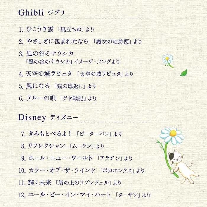 収録楽曲は、大人も子どもも一緒に楽しむことができる豪華なラインナップを収録。『魔女の宅急便』や『ピーターパン』といった人気作品の楽曲に加え、近年再び話題の『アラジン』から「ホール・ニュー・ワールド」など、名曲ぞろいの全12曲。