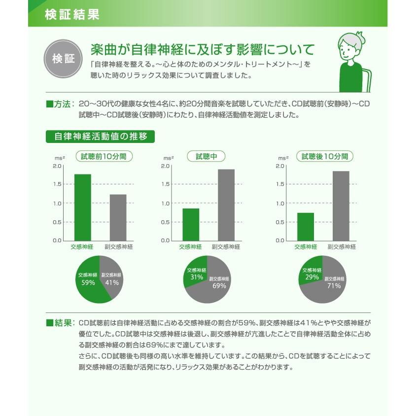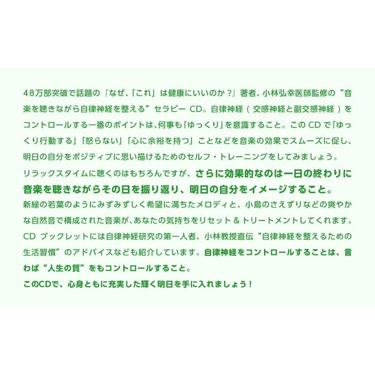 | その他商品説明 | 48万部突破で話題の『なぜ、「これ」は健康にいいのか?』著者、小林弘幸医師監修の“音楽を聴きながら自律神経を整える”セラピーCD。自律神経(交感神経と副交感神経)をコントロールする一番のポイントは、何事も「ゆっくり」を意識すること。このCDで「ゆっくり行動する」「怒らない」「心に余裕を持つ」ことなどを音楽の効果でスムーズに促し、明日の自分をポジティブに思い描けるためのセルフ・トレーニングをしてみましょう。リラックスタイムに聴くのはもちろんですが、さらに効果的なのは一日の終わりに音楽を聴きながらその日を振り返り、明日の自分をイメージすること。新緑の若葉のようにみずみずしく希望に満ちたメロディと、小鳥のさえずりなどの爽やかな自然音で構成された音楽が、あなたの気持ちをリセット&トリートメントしてくれます。CDブックレットには自律神経研究の第一人者、小林教授直伝“自律神経を整えるための生活習慣”のアドバイスなども紹介しています。自律神経をコントロールすることは、言わば“人生の質”をもコントロールすること。このCDで、心身ともに充実した輝く明日を手に入れましょう! |