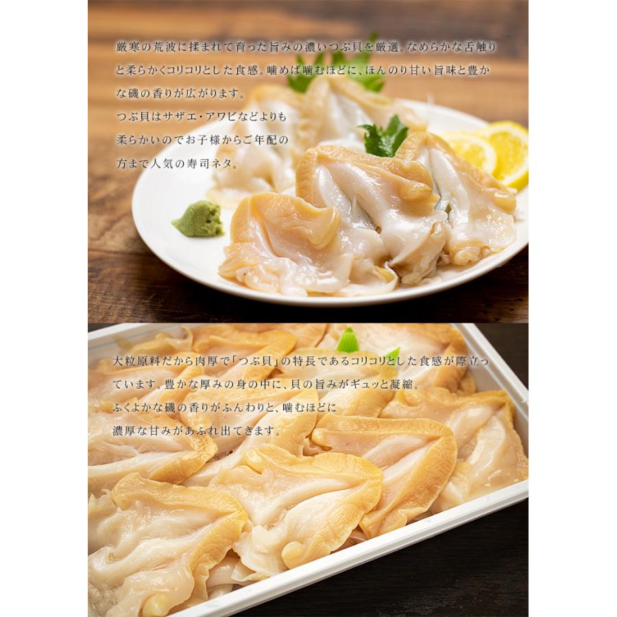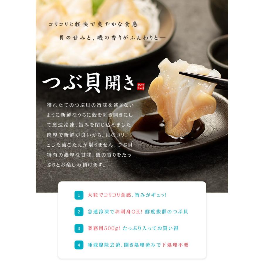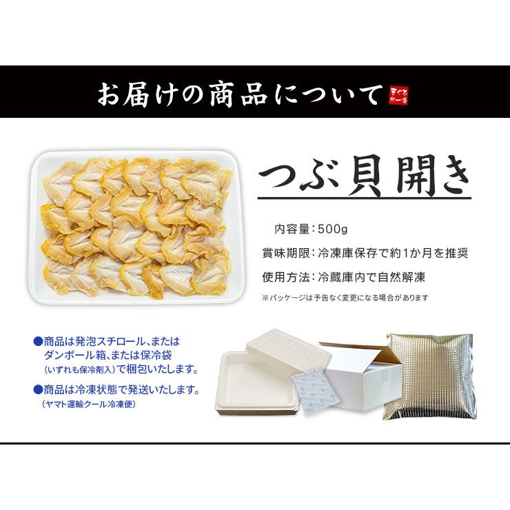 獲れたてのつぶ貝を、殻を剥き開きにして急速冷凍、旨味をギュッと閉じ込めました。肉厚なつぶ貝はコリコリとした食感。磯の香りと貝独特の豊かな甘味が絶品。冷蔵庫で自然解凍するだけで、本格つぶ貝のお刺身が手軽に楽しめます。たっぷり500gパックでギフトにもおススメです。