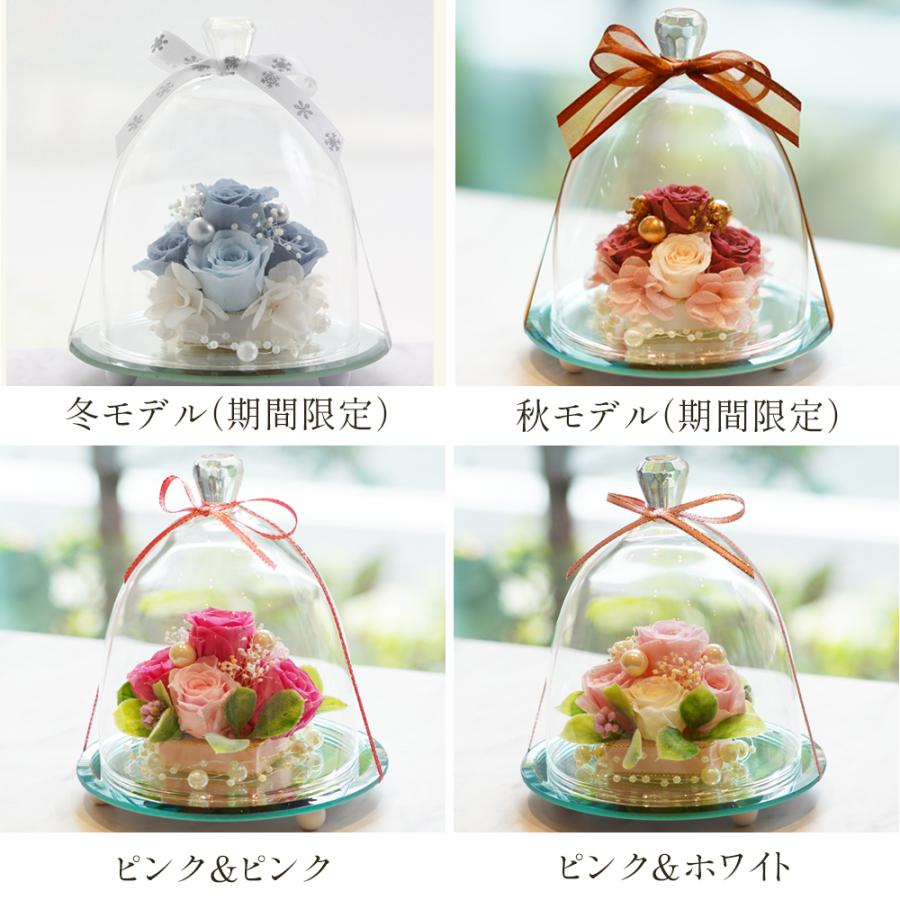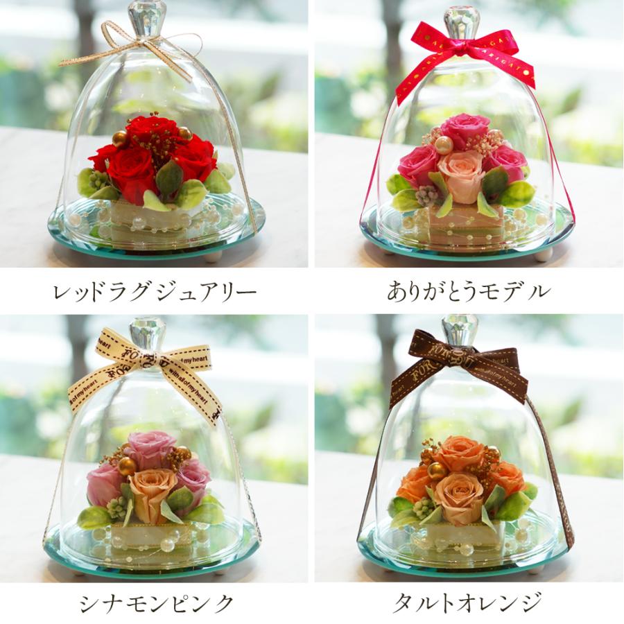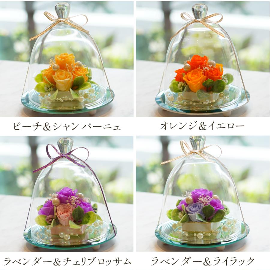 | クリスタルカットビジュー ガラスドームのトップはクリスタルカットのビジュー。 ラグジュアリーな雰囲気がただようガラスベルです。 ガラスを包むリボンも上品で華奢なさりげないものなのでプリザローズを邪魔しません。 |