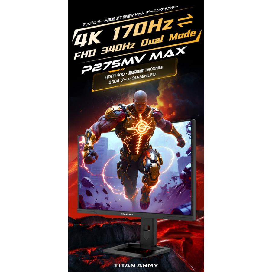 ◆デュアルモード搭載 27 型量子ドット ゲーミングモニター◆27型4K UHD HDR1400対応ゲーミングモニターTitan Army P275MV MAXはMini LED、量子ドット技術を搭載し2304ゾーンのローカルディミングに対応した27型170Hz対応のハイエンドゲーミングモニターです。