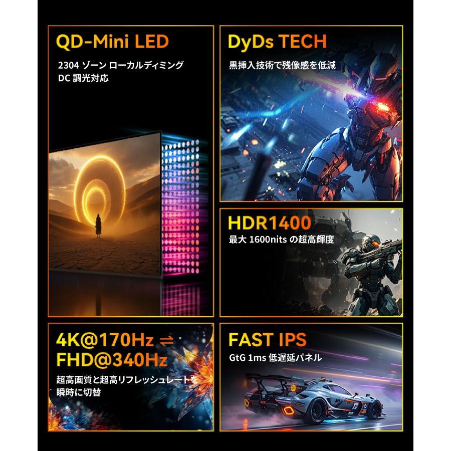 4K 170Hzだけでなく、デュアルモードによりFHD 340Hzでの超高リフレッシュレートでの動作にも対応し、素早いゲームプレイを実現します。