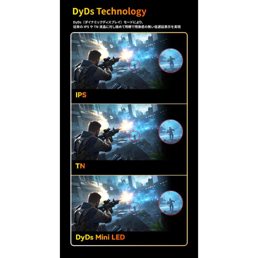また、独自のDyDs(ダイナミックディスプレイ)モードを備え、高リフレッシュレート時の残像感、ブレを低減し更に明瞭な動画表現が可能です。