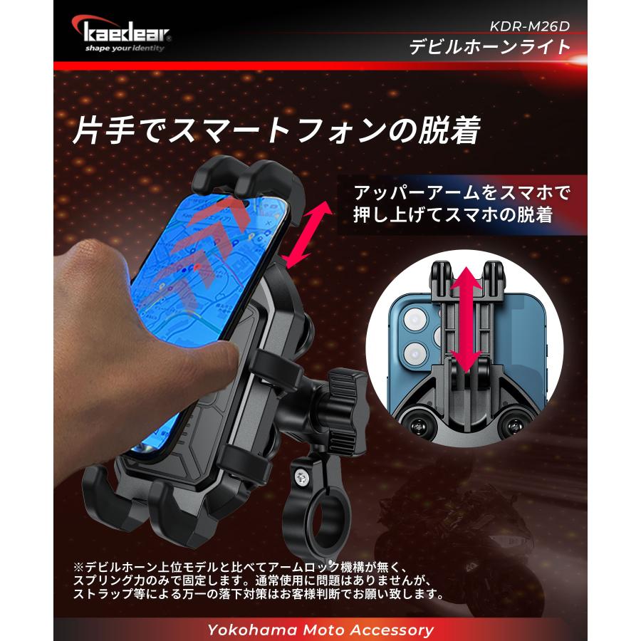 | デビルホーンライト | デビルホーンよりも小ぶりな悪魔の角がスマートフォンをしっかり固定します。 細部の造形を簡素化し、ロアアームを固定とすることで大幅なコストダウンを実現。 アッパーアームをスマホで押し上げてスマホの脱着が可能です。 両脇のガイドアームは中央を狙いやすく、横ずれ防止にもなります。 標準装備の〔Airマウント〕はエアサスの様なエアーキャップがホルダーをフロートさせ、エンジン振動による高周波を効率よく吸収し、スマホカメラの手振れ補正機能の破損リスクを軽減します。 別体のバイブアブソーバーを超える振動軽減効果を発揮しながら、段差などのギャップに対して姿勢の安定性が向上しています。 ※デビルホーン上位モデルと比べてアームロック機構が無く、スプリング力のみで固定します。通常使用に問題はありませんが、ストラップ等による万一の落下対策はお客様判断でお願い致します。 「16mmの厚さに対応したホルダーを探していた」「リーズナブルなAirマウント搭載モデルが欲しかった」「カメラの出っ張りやケースやリングなどを気にせず使用したい」、そんな方にオススメなモデルKDR-M26Dです。 |