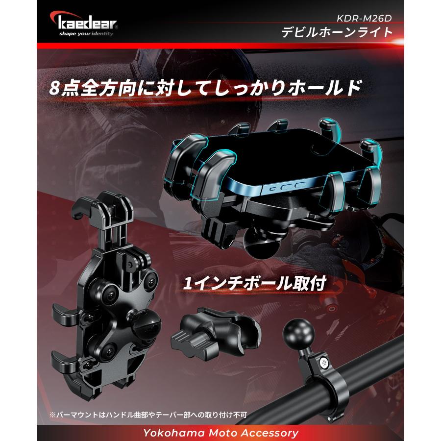 | 1インチボールマウントと中間マウント | 強度、対劣化性に優れたアルミニウム合金製マウント。2カ所の関節で自由度高くホルダーの位置を調整できます。 別売りの1インチボールマウントパーツでステムホールやミラーなど様々な条件に対応させることが可能です。(ミラー:KDR-R12、KDR-R13、ステムホール:KDR-R30A、防犯中間マウント:KDR-R1-2、マスターシリンダー:KDR-C6、KDR-R28、規格外小径:KDR-R19、KDR-R23A) |