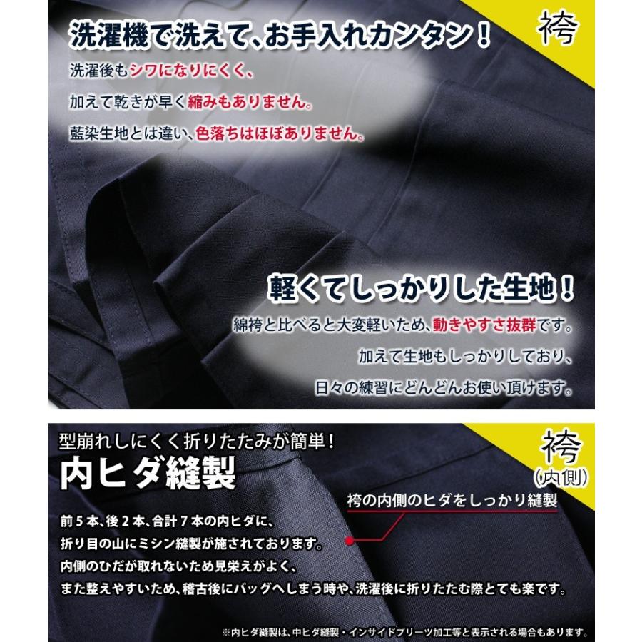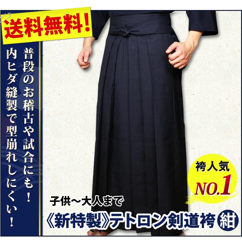 [剣道屋] 紺色 新特製 テトロン剣道袴 【5文字無料+ワンポイント刺繍無料】 内ヒダ縫製加工 子供〜大人用 ★竹刀ワックス付 ●テトロン袴・紺