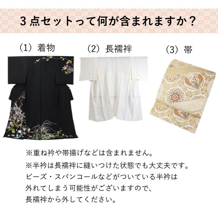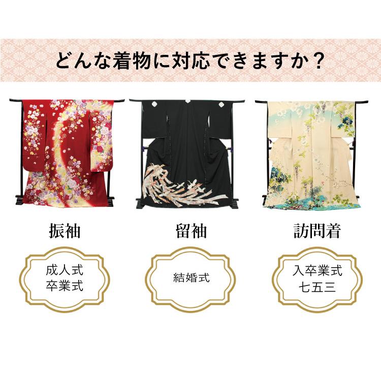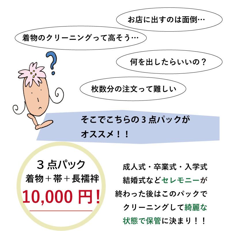 | ・着物 ・帯 ・長襦袢 合計3点のクリーニング 例)卒業式や成人式でご着用された振袖の場合 →振袖・帯・長襦袢 結婚式で親族の方がご着用された留袖の場合 →留袖・帯・長襦袢 お子様の入卒業式・七五三、結婚式やパーティーでご着用された訪問着の場合 →訪問着・帯・長襦袢 |