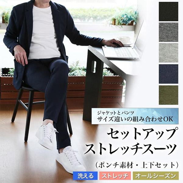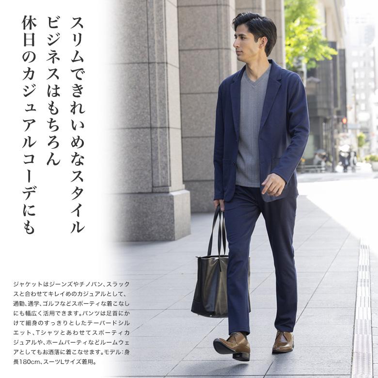 | 【オールシーズン対応】ポンチストレッチ素材・上下セットアップスーツ ストレッチの効いたポンチジャージ素材はテレワーク、 リモート会議などでもストレスを感じずきっちり感を演出します。 ストレッチ&ポンチ素材はシワになりにくく、ハリあり旅行なども持ち運びにも便利。また、ご家庭の洗濯機でも洗う事ができてお手入れも簡単です。ジャケットはジーンズやチノパン、スラックスと合わせてキレイめのカジュアルとして、通勤、通学、ゴルフなどスポーティな着こなしにも幅広く活用できます。パンツは足首にかけて細身のすっきりとしたテーパードシルエット、Tシャツとあわせてスポーティカジュアルや、ホームパーティなどルームウェアとしてもお洒落に着こなせます。ゆとり、細目などお好みに合わせ上下別サイズでのご注文にも対応致します。 |