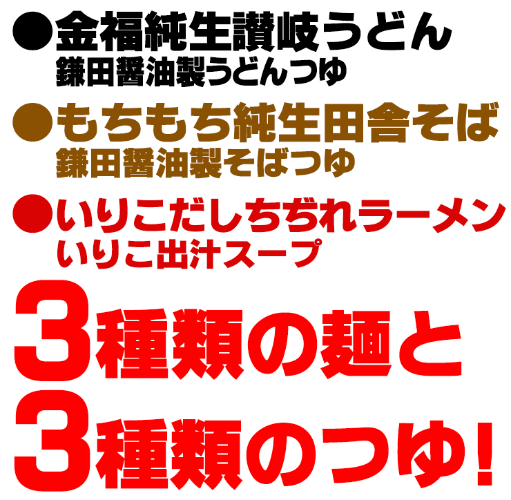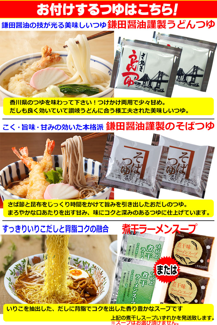 | 内容量 | ■純生讃岐うどん並切麺 1袋250g×1袋(2人前) ■純生讃岐田舎そば 1袋200g×1袋(2人前) ■ちぢれ中華麺 1袋100g×2袋(2人前) ■鎌田醤油製うどんつゆ 1袋(20ml)×4袋 ■鎌田醤油製そばつゆ(希釈用) 1袋(15ml)×4袋 ■味献上煮干ラーメンスープ 1袋(48g)×2袋 または ■煮干味ラーメンスープ 1袋(31g)×2袋