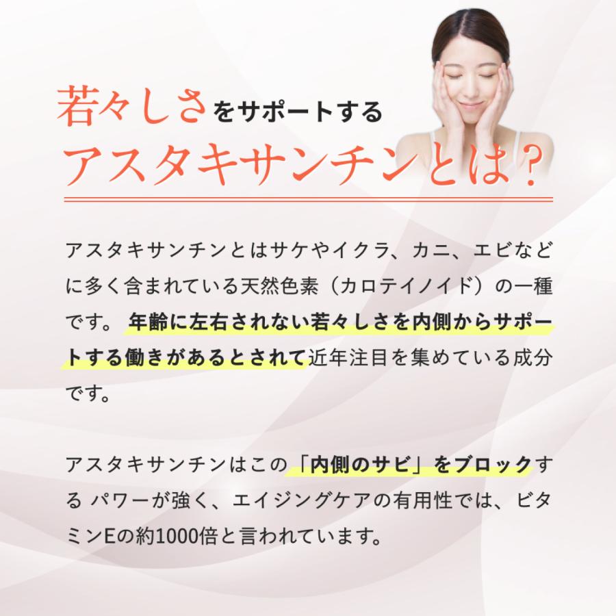 | 主要成分量 | アスタキサンチン 10mg、DHA 45mg、EPA 30mg、ビタミンE 5mg ※1粒あたりアスタキサンチン含有ヘマトコッカス藻色素が100mg配合されており、そのうちアスタキサンチンがしっかり10%(10mg)配合されています。 |
