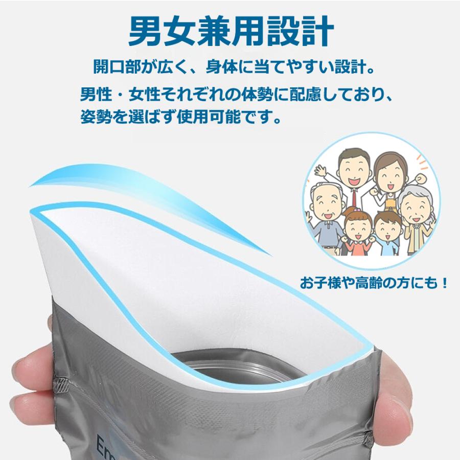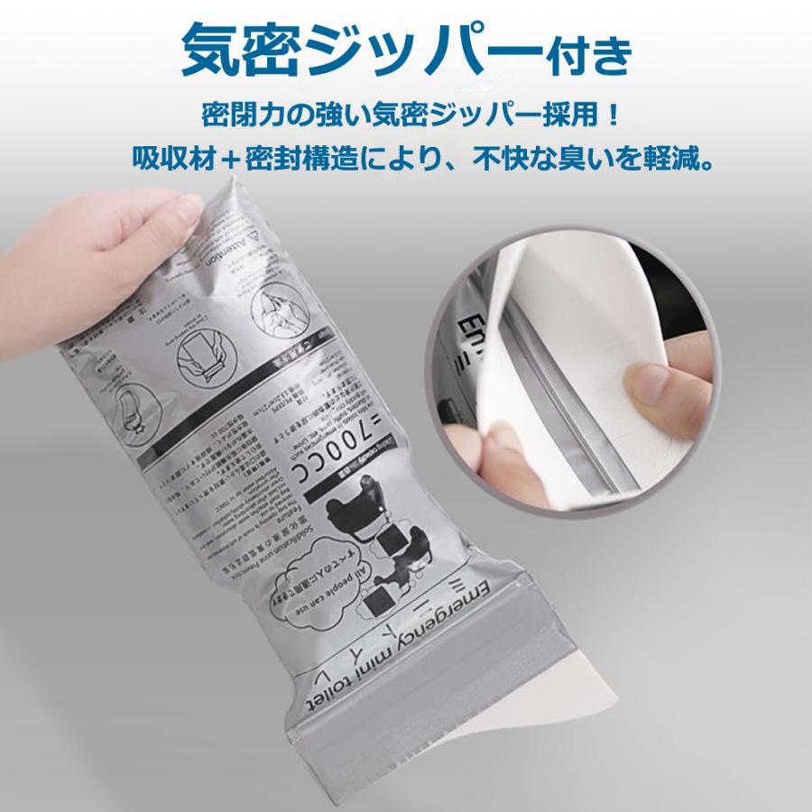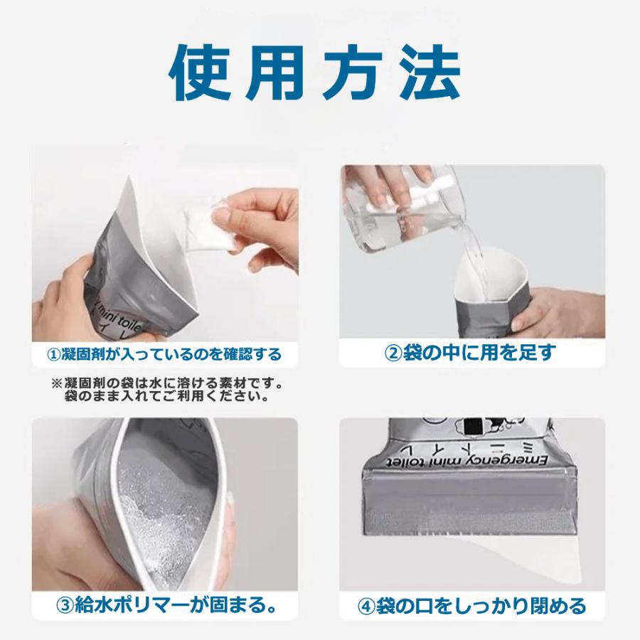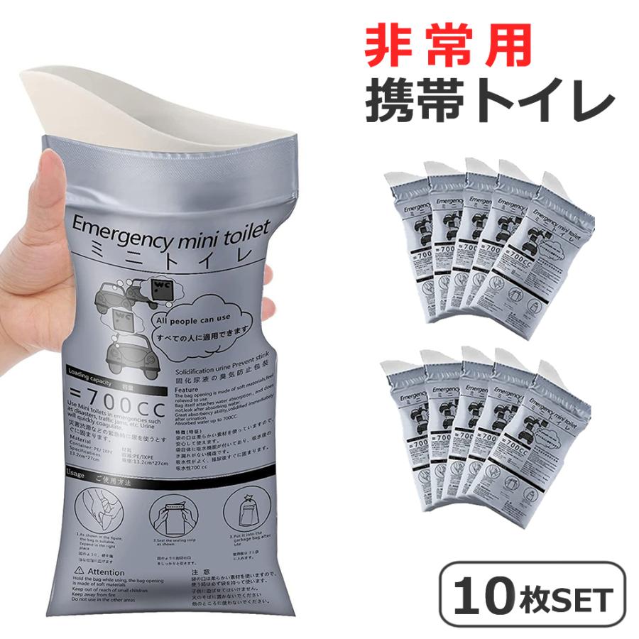 非常用 携帯トイレ 700cc/10枚入り【男女兼用】災害時・渋滞・アウトドア・介護にもしもの時に安心!備えておきたい非常用携帯トイレ■ 商品特徴◎ 強力吸収・瞬間凝固排泄後すぐに吸収剤が反応し、素早く固まって液漏れ防止。嫌なニオイも抑えます。◎ 大容量700cc1回分に十分な700cc対応で、男性・女性どちらでも安心して使用可能。◎ 男女兼用・簡単使用袋を開いてそのまま使えるシンプル設計。お子様からご高齢の方まで使いやすい。◎ 10枚セットで安心備蓄非常時・防災リュック・車載用・旅行用・介護用に最適■ こんなシーンで活躍地震・台風・大雨などの災害時長時間の渋滞・車中泊登山・キャンプ・アウトドア介護・入院・外出時の備え■ 商品仕様容量:700cc内容量:10枚入り対象:男女兼用特徴:吸収・凝固・防臭用途:非常用・携帯トイレ■ 備えが「安心」につながりますトイレが使えない状況は、想像以上にストレスになります。※処方薬を服用している場合、尿中の塩分濃度が濃い場合凝固しにくくなる可能性があります。その場合凝固剤を別途用意・追加してください。