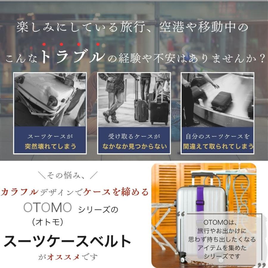 ・特徴:海外旅行でも安心な派手で目立つおしゃれなスーツケースベルト。耐久性の高いナイロン素材を幅5cmまで使用することで強度とすっきりとした見た目を実現させました。二重に巻いたり、十字にすることでスーツケースの開放防止をより強化することができます。カラフルな組み合わせでアレンジも可能なので、ターンテーブルで荷物の目印にもなる便利なスーツケースベルトです。