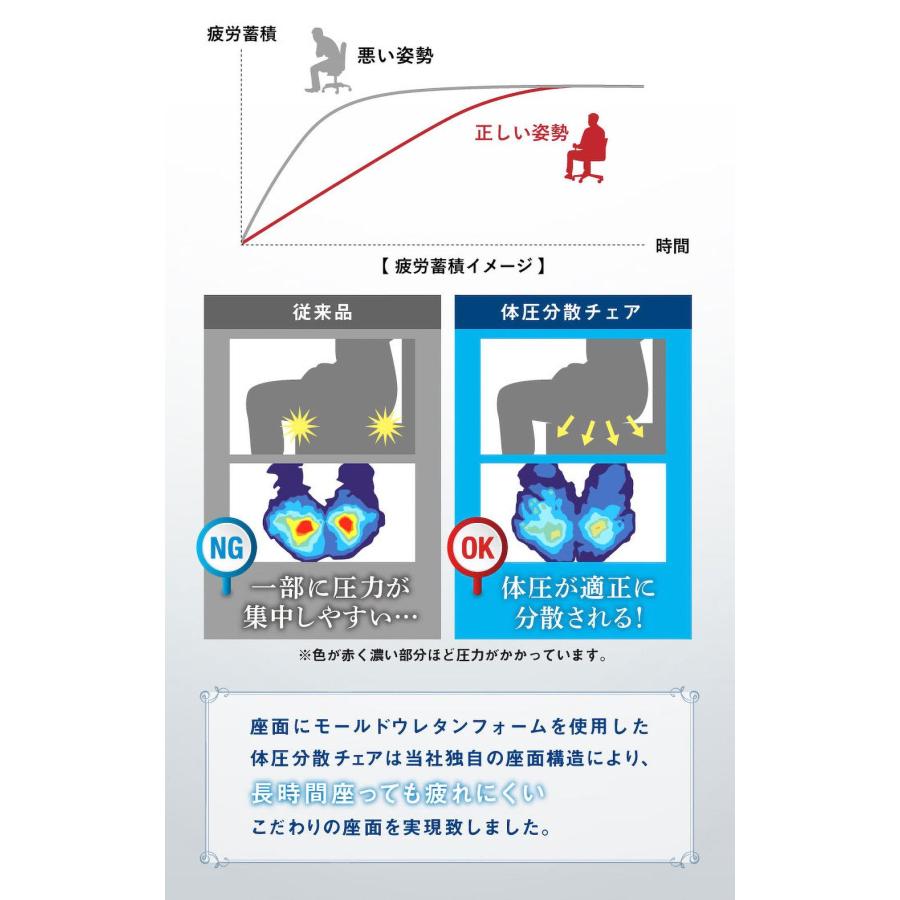 | 座面にはモールドウレタンを採用。 立体座面で体にフィットし、体圧を分散します。 腰まである大きな背もたれも特徴のひとつ。 しっかりと腰をサポートします。 長時間座っても疲れにくく、デスクワークに最適! 伸縮性のある高級な布地を使用しており、破れにくくフィット感も抜群。 座面高は400〜515mmで調節でき、低めの座面に設定すれば女性や子供も使いやすいです。 肘の後付けや取り外しも可能です。(別売) |