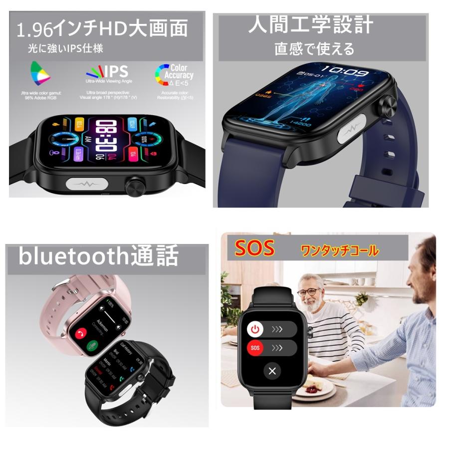 関連機能ド:スマートウォッチ 医療レベル 体温測定 採血不要 心拍計 歩数計 睡眠計 血中酸素濃度計 腕時計 Bluetooth通話 sos 呼吸訓練 睡眠改善 1.96インチ大画面 スマートブレスレット 日本語説明書 着信通知 電話拒否 睡眠検測 アラーム 時計 腕 誕生日 消費カロリー 睡眠モニター スポーツ 心拍 P67防水 GPS連携 日本語 リストバンド ランニングウォッチ スポーツウォッチ 母の日 父の日 レディース メンズ バレンタイン プレゼント キッズ 子供 父 母 ギフト お歳暮 2024 送料無料 セール 家庭用