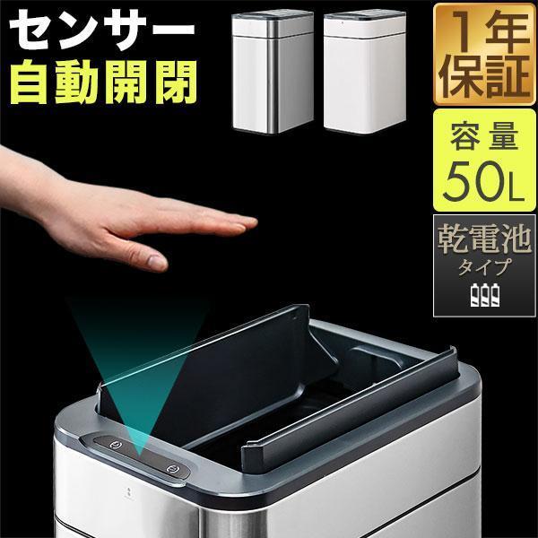 ゴミ箱 自動開閉 50L ふた付き スリム 幅 27.5cm 容量 45リットル ゴミ袋対応 センサー かざす 人感センサー ステンレス スクエア 角型 1年保証 送料無料