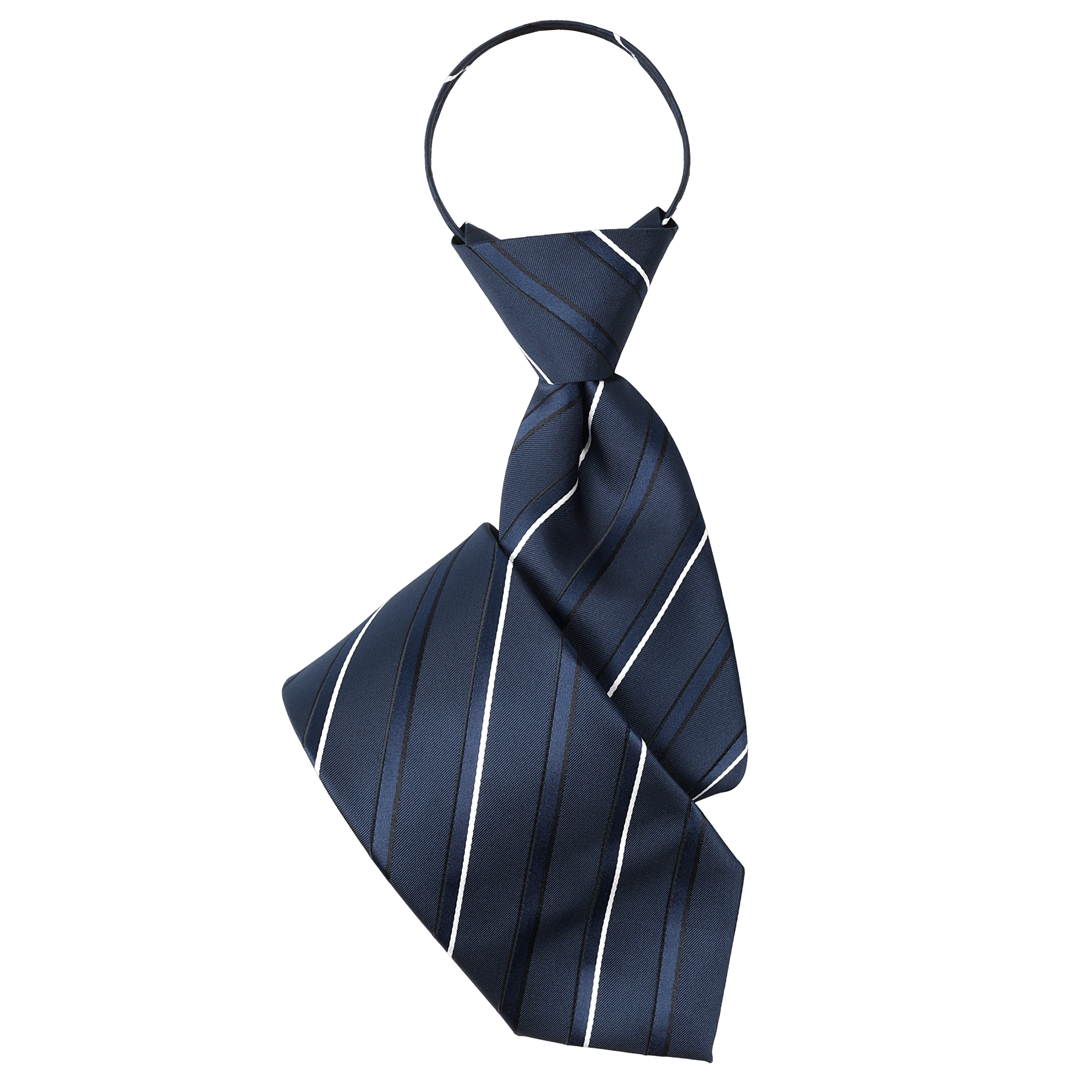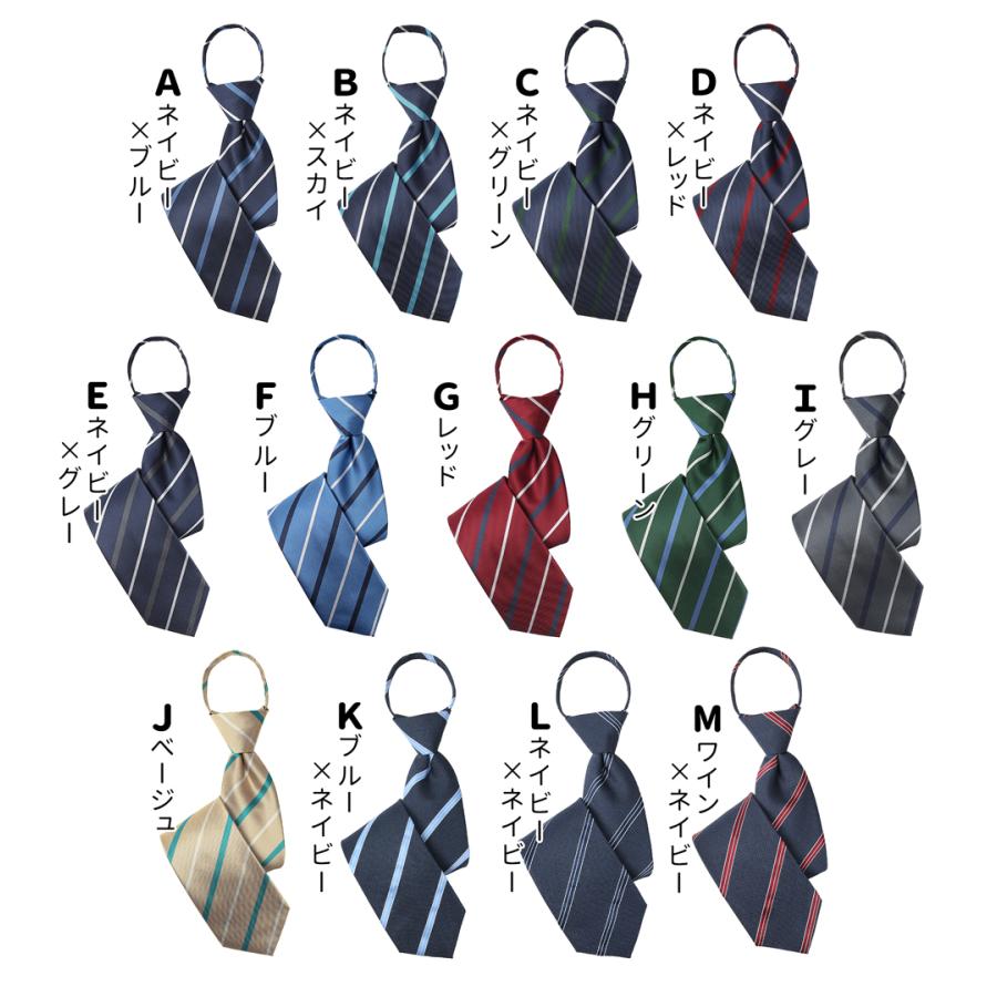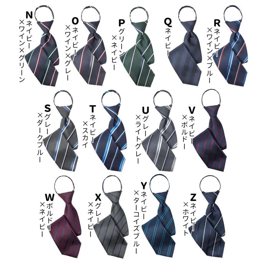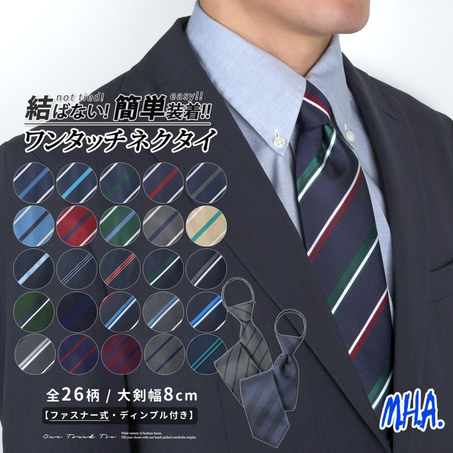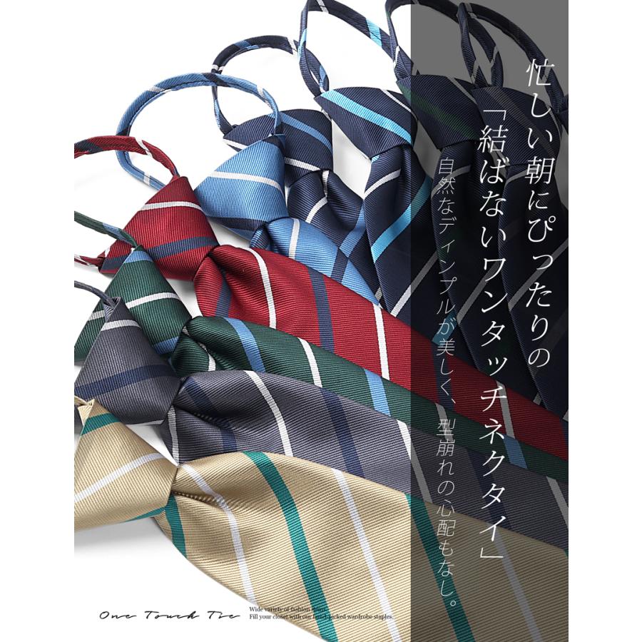結ばないから簡単、装いはきちんと。 忙しい朝でもサッと決まる【ワンタッチネクタイ】です。 あらかじめノット(結び目)が完成しているため、首にかけてファスナーを上げるだけで着用完了。 ネクタイが苦手な方や、時間に余裕のないビジネスマンにもおすすめです。 ディンプル(くぼみ)も自然に形成されており、結ばないタイプでも違和感のない美しいVゾーンを演出。 型崩れの心配がなく、一日中きれいなシルエットをキープします。 大剣幅は約8cmのレギュラー幅。 細すぎず太すぎないバランスで、ビジネスからフォーマル、就活・式典まで幅広く対応。 ストライプ柄の全25種展開で、スーツやシャツに合わせて選べます。 素材にはポリエステル100%を使用。 軽くて耐久性があり、発色の良さとシルクのような上品な光沢感が魅力です。 シワになりにくく、お手入れも簡単なのでデイリー使いにも最適。 首周りはファスナー式アジャスターでサイズ調整可能。 シャツの襟幅や首回りを気にせず、快適な着用感を実現しています。 結ばない・簡単・きれいを叶える一本。 毎日のビジネススタイルをスマートに格上げするワンタッチネクタイです。 ■カラー展開 ストライプ柄 ・ 全26色 ■素材 ポリエステル