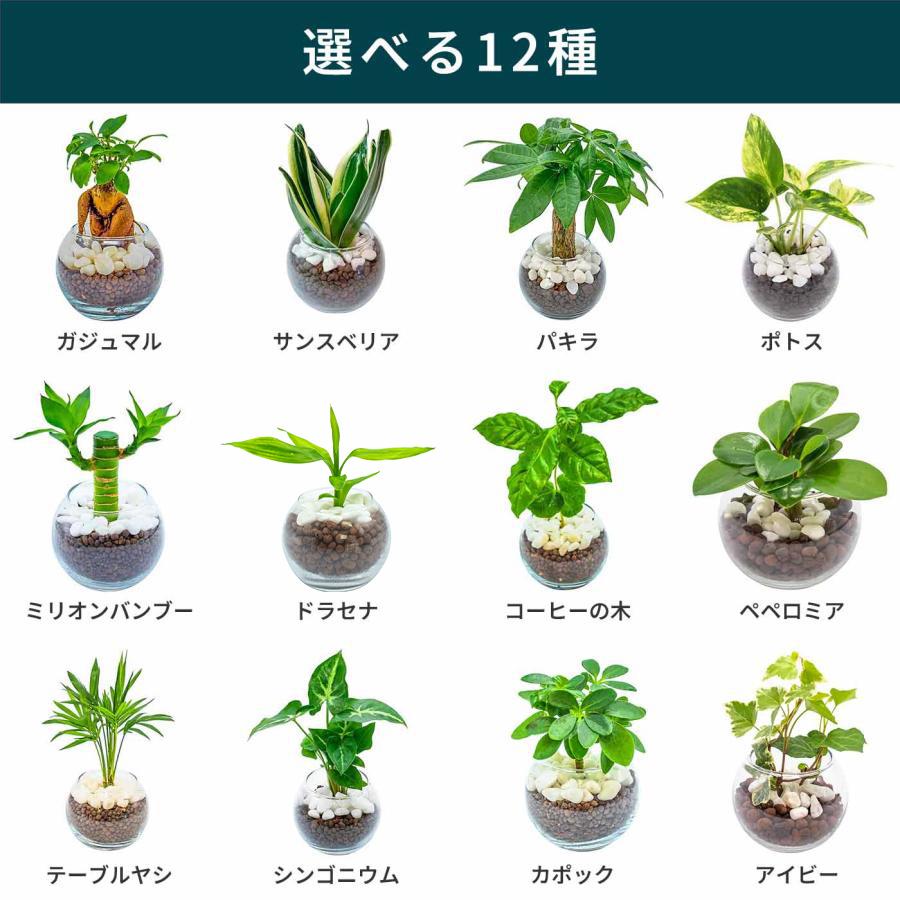 この観葉植物商品は根腐れ防腐剤のゼオライトを特殊な土「ハイドロボール」に混ぜて植えており、水耕栽培で育てられるため土を使わずに清潔に管理ができます。出荷時に観葉植物を植えてお届けするので、付属の白石をセットいただければすぐインテリア雑貨として飾ることができます。