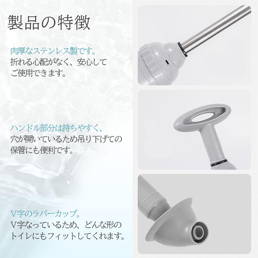 V字の先端、加圧式のポンプで水をしっかり密着して吸引排出するため、従来のすっぽん(ラバーカップ)に比べ効果絶大!細い先端は配管にフィットしやすく、操作がスムーズです。加圧式のハンドルで、押す、引くの2段階方式で使います。誰でも簡単に使えます。