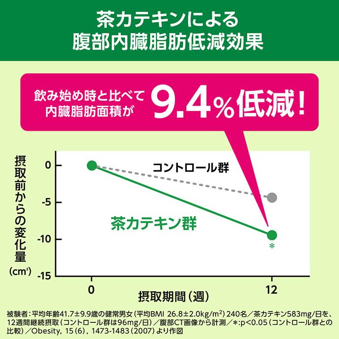| 内容 | カテゴリ:特定保健用食品、茶飲料、緑茶、PET サイズ:1リットル〜(g,ml) |