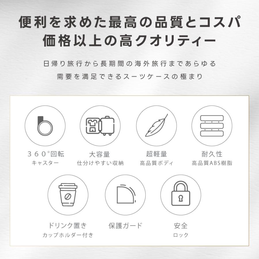 【強化ABSと軽量を両立】新設計の耐衝撃性に優れた頑丈さと軽量化を実現!美しい縦ラインのリブ加工で堅牢性アップグレードできました。軽くて弾力性と衝撃に強いABS〓脂と耐久性・熱性に優れたPC素材を配合した高品質ボディです。 【360°回転・静音キャスター】移動中の衝撃を吸収するバネが組み込まれ、走行音を軽減し、操作性・耐久性もアップします。摩擦抵抗の低いタイヤ。砂利道でも静音性が高い。ダブルキャスターが安定した走行を実現。取り回しがよくて、滑らかな移動ができる。 【大容量&多段階調節】便利な仕分けポケットで荷物を整理衛生的、乾湿を分けて収納できます。ワンタッチで調節できて、身長に合わせて使えます! 【カップホルダー搭載】背面のカップホルダーは水筒、ティーカップ、傘など手軽に置けて、旅行の楽しさが広がります! 【TSAロック】ロックは、ダイヤル式を採用。鍵の持ち歩きが不要なので、紛失の心配がないのも魅力です。TSAロックとは、アメリカ運輸保安局(TMA)によって認可を受けている鍵のことです。米国旅行の際に必須となるTMAロックを搭載して安心して海外旅行をお楽しみ! 【製品仕様】サイズ:約W34×D22×H54.5cm / 重量:約2.62kg / 容量:約38L / 材質:ABC+PC(本体)、スチール(キャリーバー) スーツケース 機内持込可能 Sサイズ 38L キャリーバッグ 7カラー 大容量 多収納ポケット キャリーバッグ スマホスタンド カップホルダー 360度回転 静音 軽量設計 ダブルキャスター 耐衝撃 大容量 旅行 出張