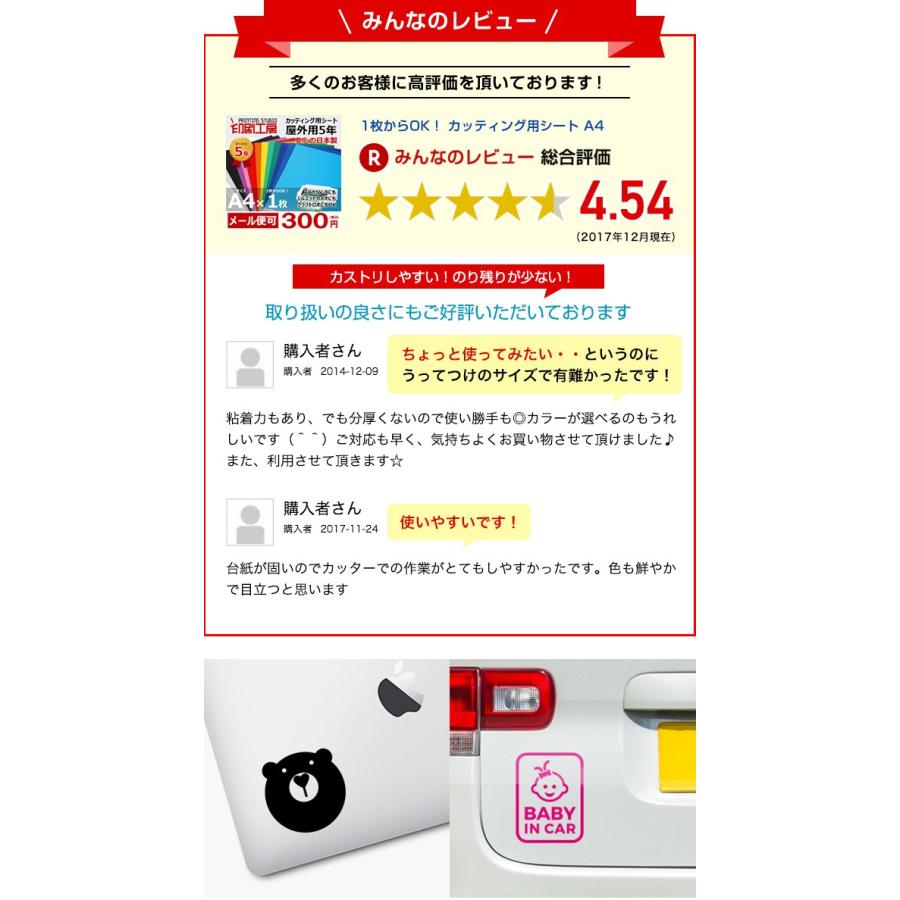 | 商品について | 屋外耐候5年のカッティング用シート シートが薄いため曲面にもなじみやすく、貼った後の施工面との段差が少ないので自然な仕上がりになります。 カス取り性に非常に優れていますので、比較的細かい図形や文字でもカス取りを楽に行うことができます。 ※非常に細かい文字や細い線などをカットした場合はカス取りが出来ない場合があります。 車のステッカーやウインドウディスプレイ、POPや屋外用看板等、さまざまな所に使用することが出来ます。 伸縮性にすぐれ、曲面施工にも向いており、ドライヤーなどで暖めることで更にシートが伸びやすくなります。 中川ケミカル製のカッティングシートと比べるとシートが非常に薄く、コシがないので、 施工時は転写シート(アプリケーションシート)のご使用をお勧めいたします。 カッティングシートのご購入はこちら ▼貼り付け作業について [1]シートを貼りつける施工面を、中性洗剤などで洗い、ゴミ・ホコリ・油分をしっかり落とします。その後よく乾かして下さい。 [2]裏の台紙を慎重にはがしながら、スキージなどを使いステッカーを貼って行きます。 [3]最後まで貼れたらもう一度しっかり押さえて下さい。 [4]しっかり貼れていることを確認しながら、転写シートをゆっくりとはがして下さい。 【低温】10℃以下の場合 初期粘着が低下し貼りづらくなります。ドライヤーなどで暖めると貼りやすくなる場合があります。 【高温】30℃以上の場合 初期粘着が向上し貼りづらくなります。屋内など 風通しのよい涼しい場所で作業してください。 |
