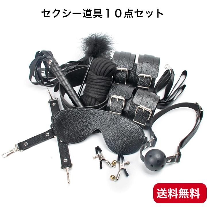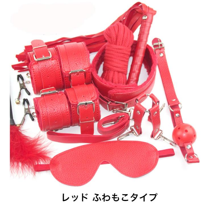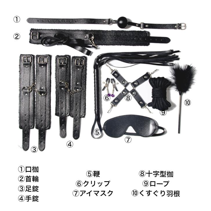 鞭、アイマスク、首輪、口枷、手錠、足錠、ロープ、クリップ、十字型枷、くすぐり羽根 10点