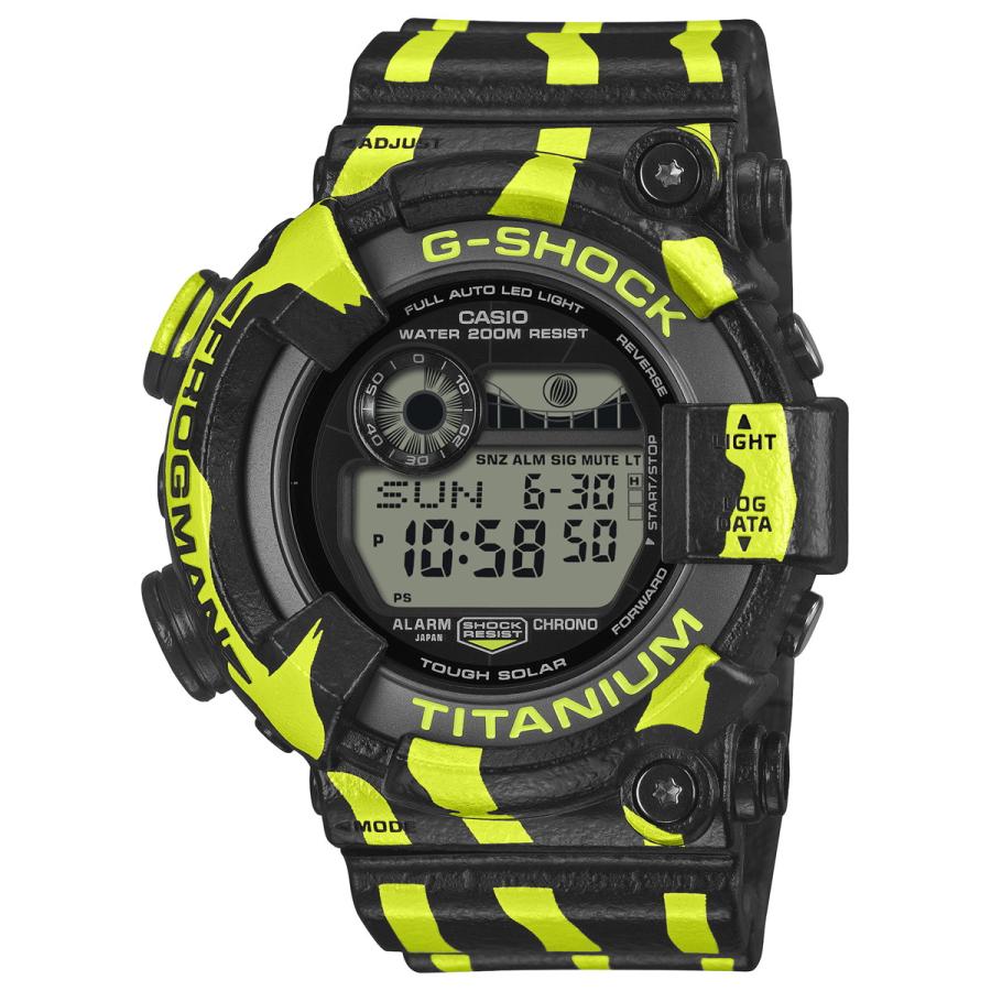 “ミスジヤドクガエル(Three-striped Poison Frog)”をモチーフにデザインした、ISO規格200m潜水用防水機能を持つ本格ダイバーズウオッチ「FROGMAN(フロッグマン)」です。南アメリカの熱帯雨林に生息する縦縞模様のミスジヤドクガエルからインスパイアを受け、そのタフさとユニークな警告色を表現しています。ブラックベースに大胆な蛍光グリーンの縦縞模様を施し、ミスジヤドクガエルの強力な毒性を象徴する鮮やかでタフなデザインに仕上げました。でこぼこの皮膚の質感はバンドとベゼルへのスプレー塗装で再現しています。さらに、FROGMANシリーズには欠かせないケース裏のカエルのキャラクター刻印も、ミスジヤドクガエルの縦縞模様を纏った特別仕様に仕上げています。タフソーラーを備え、蛍光灯のわずかな光でも発電し、強負荷のかかる各種機能を安定駆動。定期的な電池交換の手間を省きます。