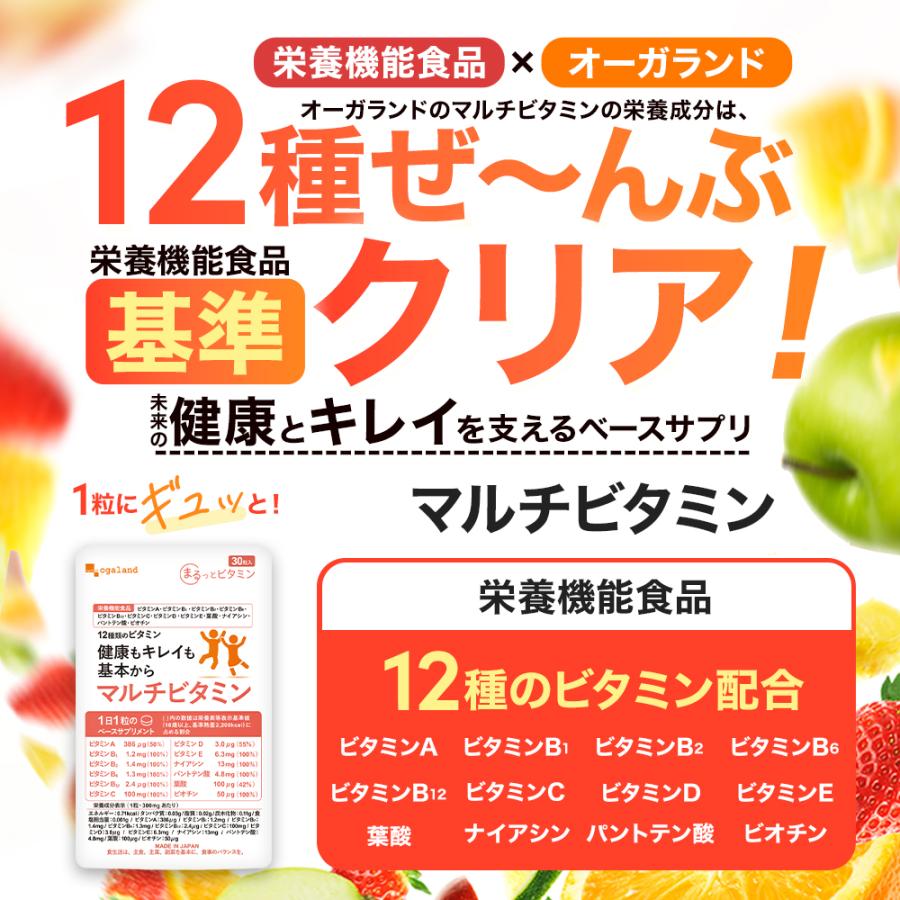 マルチトール(国内製造)、ビタミンE含有植物油、黒コショウ抽出物/ビタミンC、セルロース、ナイアシン、HPMC、パントテン酸カルシウム、加工デンプン、ステアリン酸カルシウム、CMC-Na、微粒酸化ケイ素、ビタミンB6、ビタミンB2、ビタミンB1、ビタミンA、葉酸、ビオチン、ビタミンD、ビタミンB12