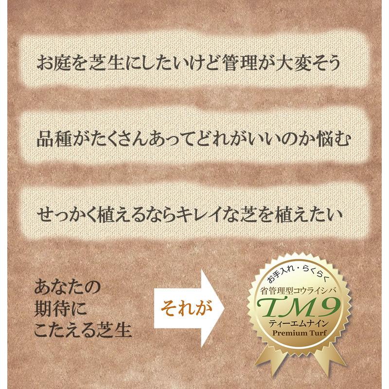 TM9とは、トヨタが芝刈りの回数を減らす目的で開発した省管理型の高麗芝です。TM9は高密度・濃緑の葉で、見た目がとてもきれいです。TM9は葉の伸びが他の芝生に比べて遅く、刈り込み・お手入れの回数が少なくて済みます。TM9の葉は柔らかいので、転がっても痛くありません。TM9は一般家庭向きの芝生です。当店はTM9の正規生産販売店です。 |