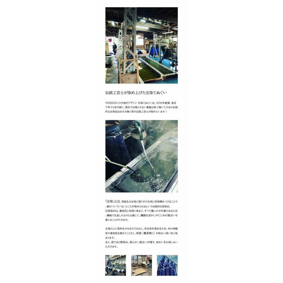 『こちらの商品はメール便での配送も可能です!(送料220円)』 詳しくはこちら> ■注意点 ※メール便での発送の場合、基本他の商品との同梱は出来ません。 ※ただし、アクセサリー、雑貨・小物 (例えばエアーフレッシュナー等) などで厚みのないメール便で送れるサイズの商品であれば同梱は可能です。 その他詳細はお手数ではございますが、お問い合わせください。 【価格改定のお知らせ ※2025年6月7日 (土) より】 昨今の経済状況 (原材料、物流コスト、人件費等の高騰) の影響により、卸価格の値上げが行われ、それに伴い、販売価格も改定となりました。 従来価格2,200円 (税込) → 改定後の価格 (現在の販売価格) 2,640円 (税込) ※440円の値上げとなります。 ご迷惑をお掛けしますが、何卒ご理解・ご賢察の程お願い申し上げます。 伝統刺青の彫り師による手描きの柄を日本の伝統的な染工技術、注染によって全てを手作業で仕上げた日本手ぬぐいです。 柄は悪の華 (Badass Flower) 。 奔放に描かれたケシの花とパイプ。 ケシは古より鎮痛、催眠効果の高い薬として用いられ、歓喜、至福をもたらす植物と呼ばれています。 争うことよりも楽しめる仕事と音楽と瞑想を大事にする時代だと思います。 伝統工芸士が染め上げた注染てぬぐい TENUGUI VERSION のてぬぐいは、伝統的な染色方法「注染 (ちゅうせん)」を用いて造られています。 「注染」とは、型紙を白生地に張りその生地に防染糊をつけることで、糊のついていないところが染められるという伝統的な型染め。 注染染めは、裏表同じ色柄に染まり、すべて職人の手作業であるため、機械で生産したものと比較して、繊細なぼかしやにじみの風合いを感じることができます。 生地の上に染料をのせるのではなく、糸自体を染めるため、布の伸縮性や通気性を損なうことなく、両面 (裏表無く) が味わい深い色に染まります。 また、使うほど馴染み、柔らかい風合いが増す、味わいをお楽しみいただけます。 伝統刺青の彫り師による手描きの柄 1998年から手彫りの彫師として活動。 日本の伝統的な模様やデザインを深く理解しており、その知識や経験を活かした作品を仕上げます。 同じ柄でも染めのにじみ具合が絶妙に異なる、ひとつとして同じものは存在しない手染めてぬぐいとの相性は言うまでもありません。 【TENUGUI VERSION】 VERSION の手描きデザイン・注染てぬぐいは、1936年創業、東京下町で4世代続く、現在では残り少ない貴重な染工場にて日本の伝統的な注染技法を引き継ぐ若き伝統工芸士が染めています! 【RADIALL】 デザイナー / 高山 洋一 2002年、東京にてブランド設立。 RADIALL の「ファッション」をデザインするにあたり、大切なテーマのうちの一つに「土俗性 / Locality」を挙げています。 ルーツミュージック、ローライダー、ローブローアートなど、その時代、その環境、その場所だったからこそ発生した文化に敬意を払い、私たちもそうであるように、この時代、この環境、この場所だからこそ提案できる洋服作りを常に追い求めています。 ※RADIALL(ラディアル)の定番アイテムとして定着している手ぬぐいはすべて手ぬぐいブランド TENUGUI VERSION との共作となっております。 【注意点】 注染の手ぬぐいは、にじみが出やすい特性があります。 これは、染色時に染料が生地に浸透していく際に、自然に起こる現象です。 こちらは注染の愛すべき特徴で不良品ではございません。 予め、ご了承ください。 色落ち 注染で染められた手ぬぐいを洗うと、2、3回はどうしても色落ちします。 最初は他のものと一緒に洗わず、手ぬぐいだけで水洗いすることをおすすめ致します。 洗面所で洗って絞っただけですぐに乾きますのでそこまで手間ではないと思いますので。 2、3回の洗濯が終わると色落ちはおさまり、以降は使いこむほどに色が落ち着いて風合いが増してくるようになります。 切りっぱなし 手ぬぐいは両端が切りっぱなしになっていますので、使って、洗っていくうちに当然ほつれは出ますが、ある程度すると止まっていきます (横糸のみハサミで切って処理していただくと、よりほつれにくくなります) 。 端の部分を折り込んで縫ってしまうと、縫った部分に水分がたまって、その部分だけ通気性が悪くなり、乾きにくくなってしまうため、利便性・衛生面も考えて端は切りっぱなしとなっています (これが定番で正解です) 。 急な雨天時、暑い日の汗、日除け、銭湯、温泉、台所、キャンプ、職場、ガレージからストリートまで場所や時、人を選ばず大活躍のてぬぐい! 手拭きとして、頭に巻き汗止めとして、キャップやハットの中に被り日除けとしても重宝します。 バンダナ以上に通気性と伸縮性に優れ、実は用途も広い。 バンダナ同様、パンツのヒップポケットに忍ばせておくと、ファッション面以外にも重宝します (例えば、外出時の手洗い時には必ず使います) 。 そして、バンダナ以上に贈り物にも最適です! 【サイズ】 縦100cm / 横34cm (約) ※一般的に手拭