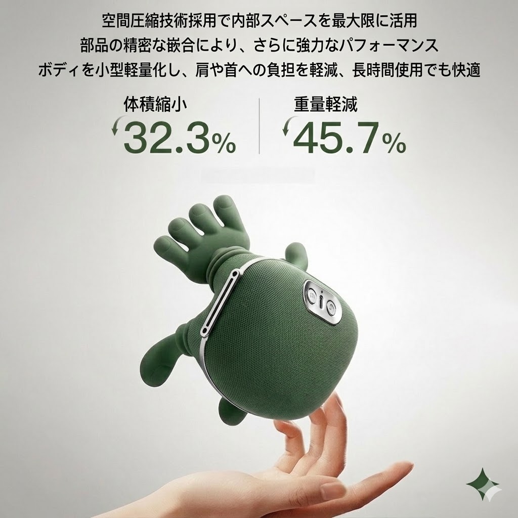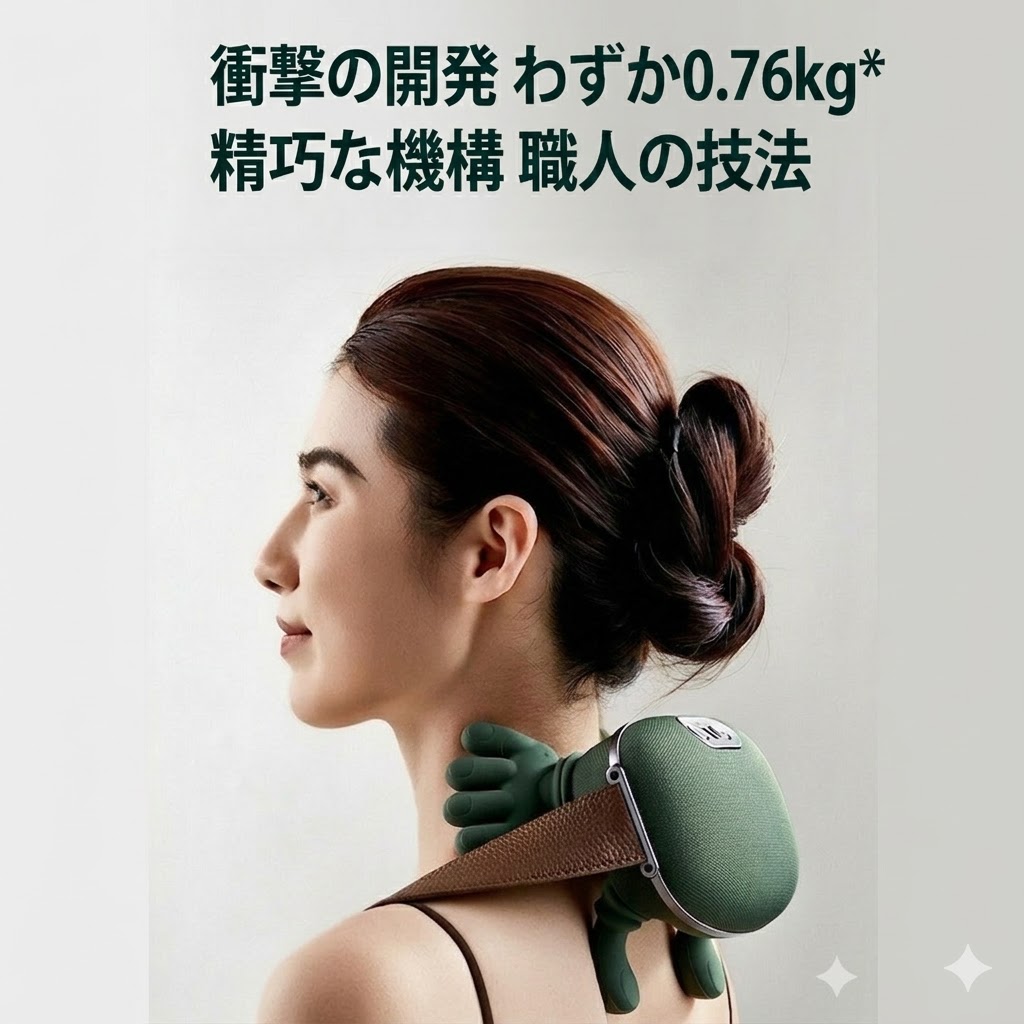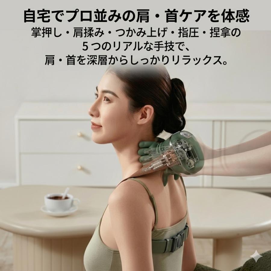 特別に開発された人型ハンドヘッドが、プロの施術師がもみほぐすような深い押圧感と揉捏感を再現。肩や首の凝り固まった筋肉に、指先が入り込むような刺激を与え、単なる振動では届かない深層部の疲れまでしっかりほぐします。