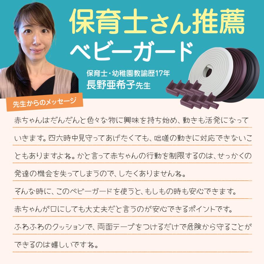 つかまり立ちやヨチヨチ歩きをはじめた赤ちゃんは、家具の端で頭や顔をぶつける危険が高く、大ケガにつながる心配があります。あらかじめケガをしやすい場所に、ベビーガードを取り付けておけば、赤ちゃんが動き回って転んでも安心。ホワイト、ブラウン、ブラック、メープル、ナチュラルの5色からお選びいただけます。