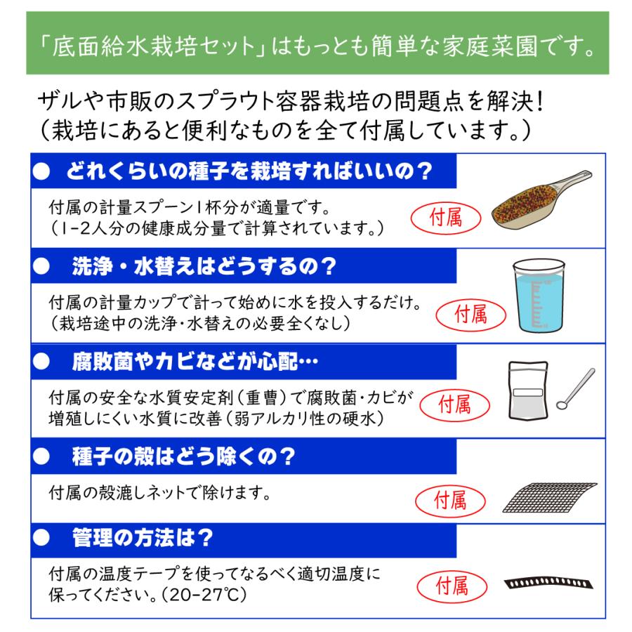 そこで、栽培に必要なものを全てセットにして、説明書通りに栽培すれば正確に失敗なく必要な健康成分摂取目安量を栽培できるようにしました。種子200mlにオマケで付属する「底面給水栽培セット」を用いれば、初めての方でも収穫まで洗浄の必要がなく簡単に栽培できます。