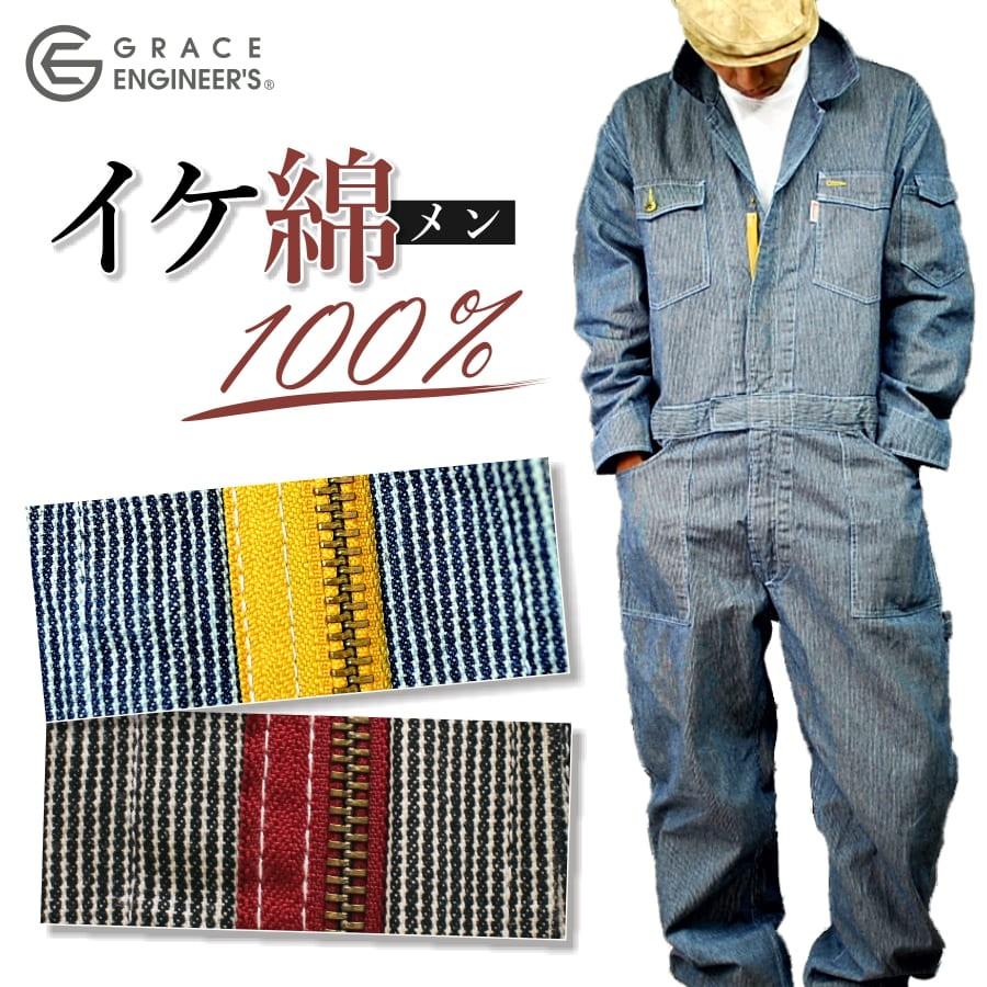 送料無料 グレイスエンジニアーズ ヒッコリーオーバーオール GE-105 綿100% 長袖 メンズ レディース つなぎ オールインワン おしゃれ アメカジ バイク 車 DIY