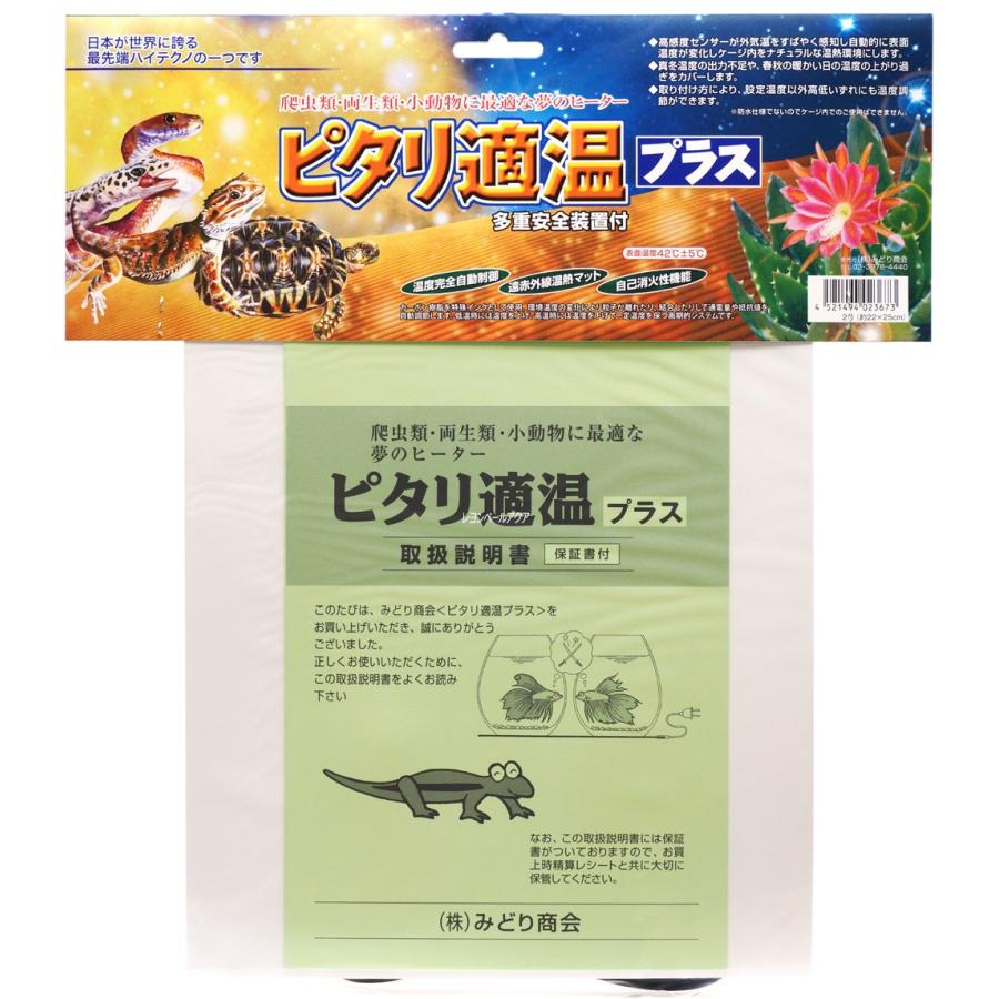 ピタリ適温プラス2号は、爬虫類や両生類、小動物向けの底面ヒーターです。サイズは22×25cm、8Wの出力で、外気温に応じて表面温度を自動的に調整し、安定した保温環境を提供します。難燃フィルムを使用し、多重安全装置が付いており、過昇温を防止します。ケージ外に設置して使用し、室温が低くなる冬場にも効果的です。