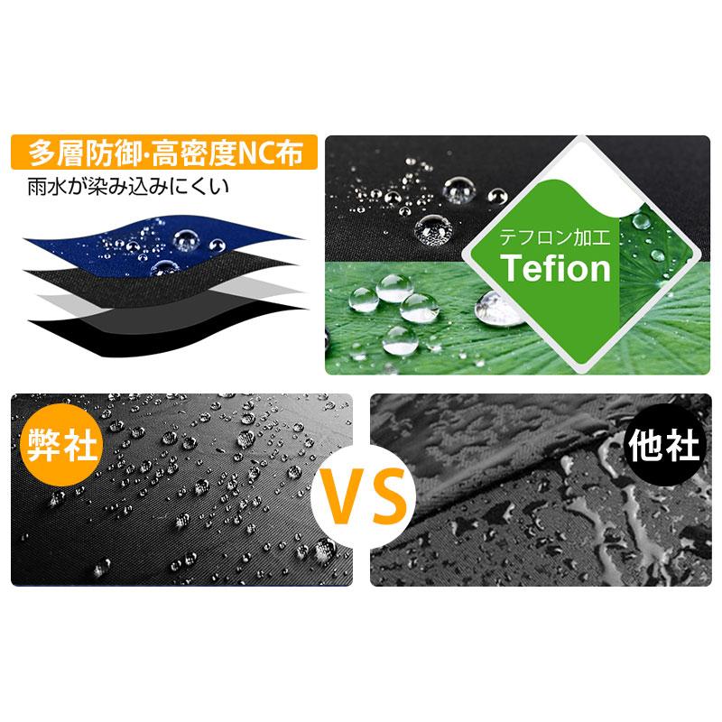 高密度NC布採用、超撥水のテフロン加工が施されています。傘を閉じた後、軽く振るだけでしっかり雨を弾き、体やバッグをしっかり守れますし豪雨でも対応できます。雨が染み込んでも臭くなりません。