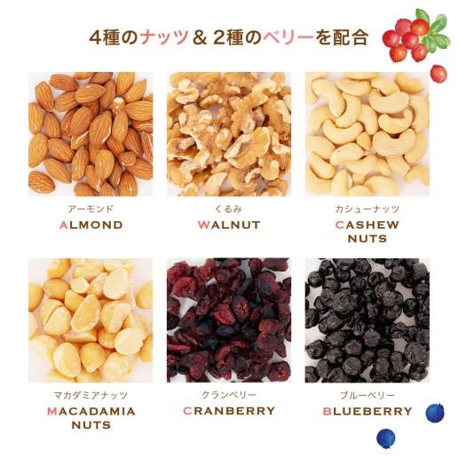 | 原材料名 | アーモンド(アメリカ)、くるみ、ドライクランベリー(クランベリー、砂糖、植物油)、カシューナッツ、マカダミアナッツ、ドライワイルドブルーベリー/酸味料、香料(オレンジ由来) | ||||||
