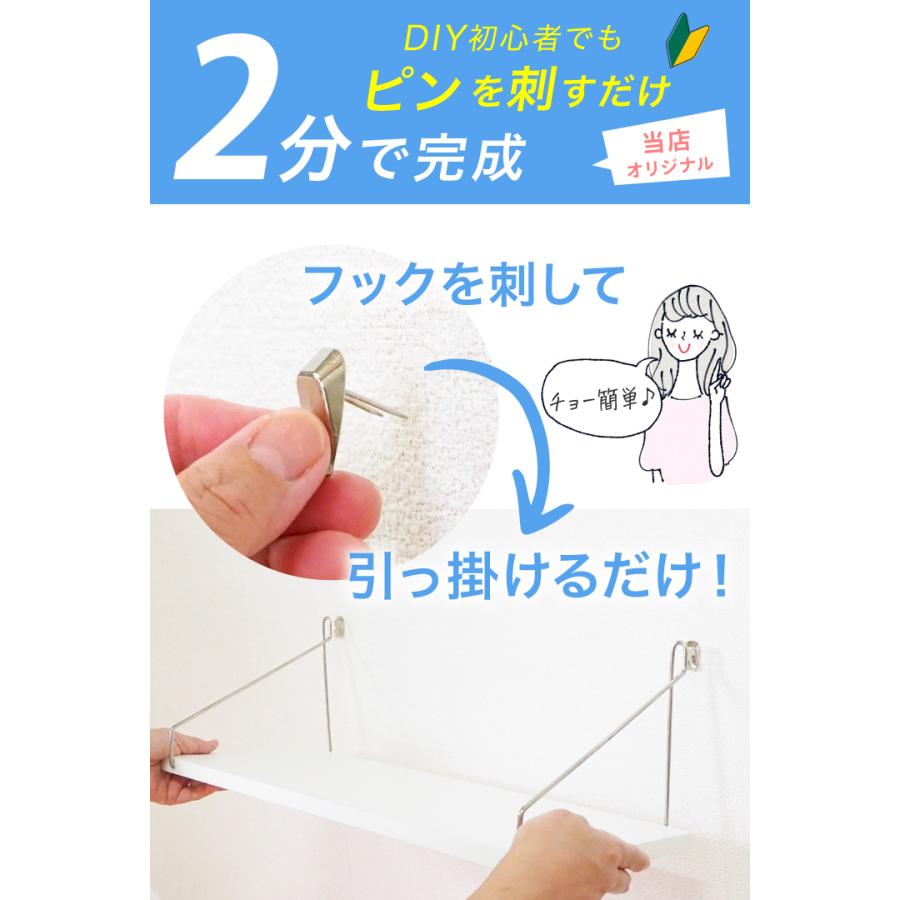 取付はフックを壁に刺すだけ。画鋲ほどの小さな穴しか開かないので、原状回復も簡単です。女性でも2分で設置可能なミニハンマー等の工具もフルセットでお届けします。