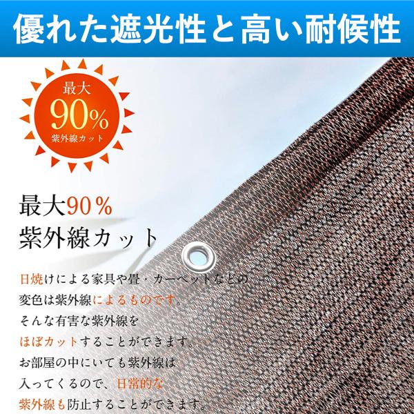 紫外線を約90%カットし、遮光率は約85%です。通気性に優れ、明るさも確保されています。