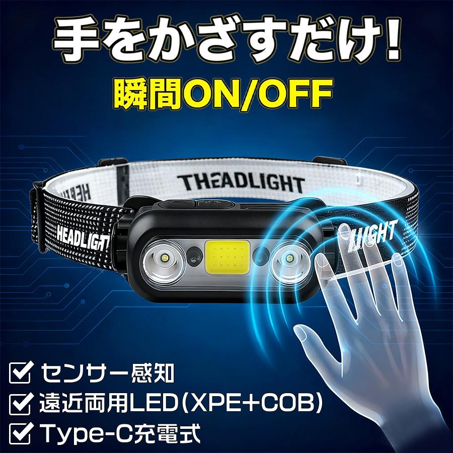 ヘッドライト 充電式 センサー搭載 led Type-C充電 最大15時間 超軽量100g 高輝度4500LM 7モード 45°角度調整 コンパクト 登山 釣り 夜間作業 防災