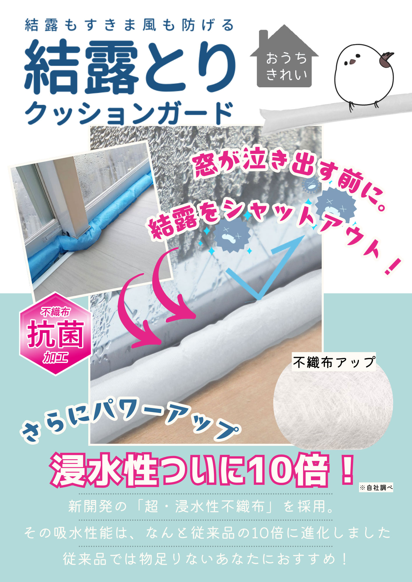 NEW 浸水性アップ新不織布タイプはコチラ?冷気もすき間風も防ぐ 結露とり クッションガード寒い季節、窓からの結露や冷気が悩みの種ですよね。
