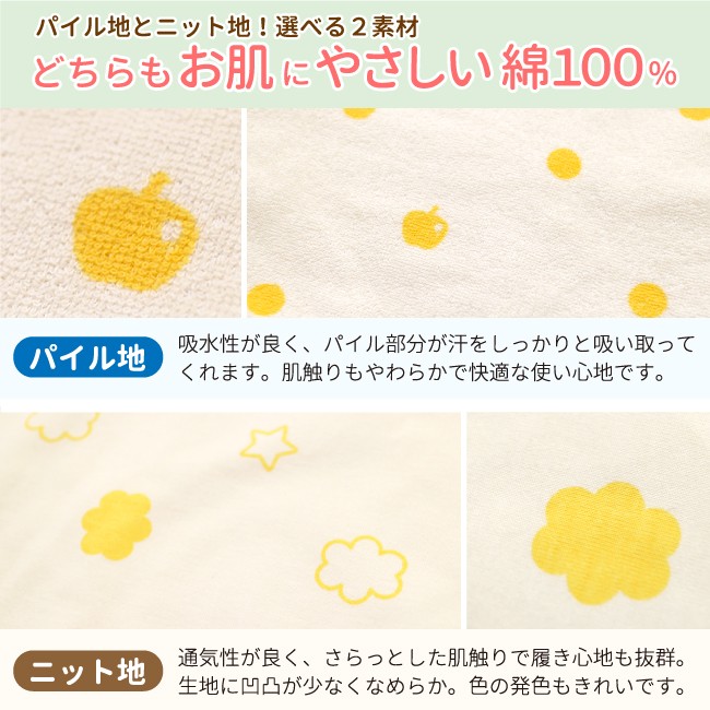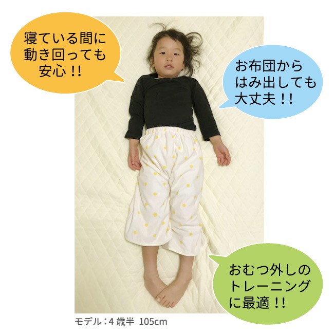 | 商品について | おねしょ対策ケット(ズボンタイプ)は防水仕様のため、敷布団・シーツ・掛布団が濡れてしまうのをふせいでくれます。オムツ外しのトレーニングや、おねしょ対策に最適です。表側はお肌にやさしい綿100%の選べる「パイル地」「天竺ニット地」の2素材で肌触り抜群!表側の裏面は防水仕様なので布団を守ってくれます。ズボンタイプなので寝返りを打ってもズレずに安心。 ※完全防水ではございません。 |