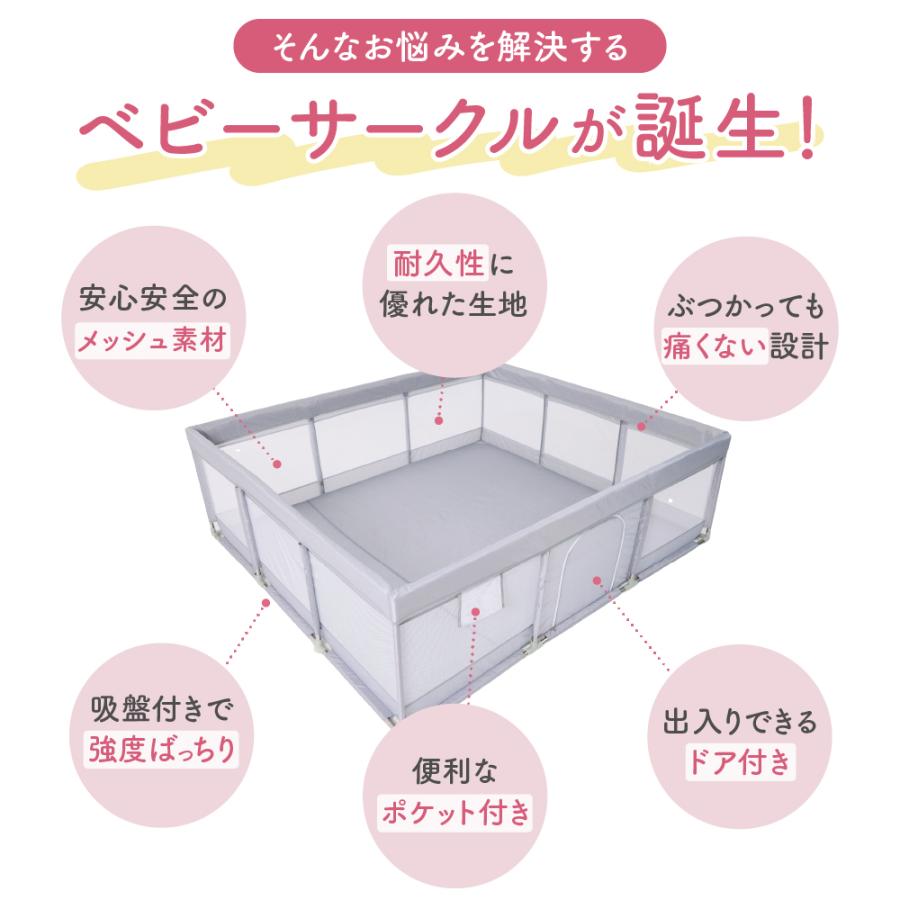 赤ちゃんセキュリティ商品でおなじみBabyGooからメッシュタイプのベビーサークルが誕生!ベビーサークルは、赤ちゃんが室内で危険なものに触れたり、ぶつかったりしないように守るための安全グッズです。本製品はクッション性のあるメッシュ素材を使用しており、万が一ぶつかっても痛くなく、内側からも外側からもお互いの様子が見えるので、大人も子どもも安心して過ごせます。 生後半年頃からの赤ちゃんは、ハイハイやつかまり立ち、よちよち歩きと目が離せない時期。料理や掃除、アイロンがけなどの家事をしている間も、赤ちゃんの安全が気になるものです。リビングにはコンセントや小さな物など、触れてほしくないものも多くあります。そんな目の離せない赤ちゃんとの暮らしにぴったりのアイテムです。【保育士監修】現役保育士で1歳児のママ斎藤美穂先生監修のメッシュ ベビーサークルです。0歳〜1歳児のお子様の行動パターンを知り尽くしたプロが「安全面」「衛生面」だけでなく「家事のしやすさ」まで細部まで徹底監修しました。【ぶつかっても痛くない安全設計】ケガ未然に防ぐ角無し設計、クッションを装着したシートカバー、ぶつかっても破れないオックスフォード生地など、あらゆる安全設計を実現。安心してお子様を遊ばせることができます。【あらゆるインテリアにマッチする5サイズ×2カラー展開 】【サイズ】■120×70cm、■120×160cm、■140×200cm、■160×200cm、■180×200cm 【高さ】(全サイズ共通):65cm ※±2~3cm程度の誤差が生じる場合がございます。【カラー】グレー、ベージュ【カラーでわかりやすい取扱説明書】組立ての難しさを解消するために取扱説明書をカラー表示でわかりやすくしました。組立てが苦手な方や女性一人でも簡単に組み立てられます。【お肌に触れるものだから安全検査合格品】第3者機関で製品のホルムアルデヒド試験合格済みの「なめても安心の素材」を採用しています。【ポケットで使いやすさUP】おむつやおしりふき、おもちゃなどをすぐに取り出せる便利ポケット♪収納バッグも付いて、お出かけにもぴったり!【吸盤付きで強度もばっちり】全てのジョイントパーツに吸盤を取り付いているので、床にしっかりと固定されます。お子様が体重をかけても倒れる心配なくご使用いただけます。