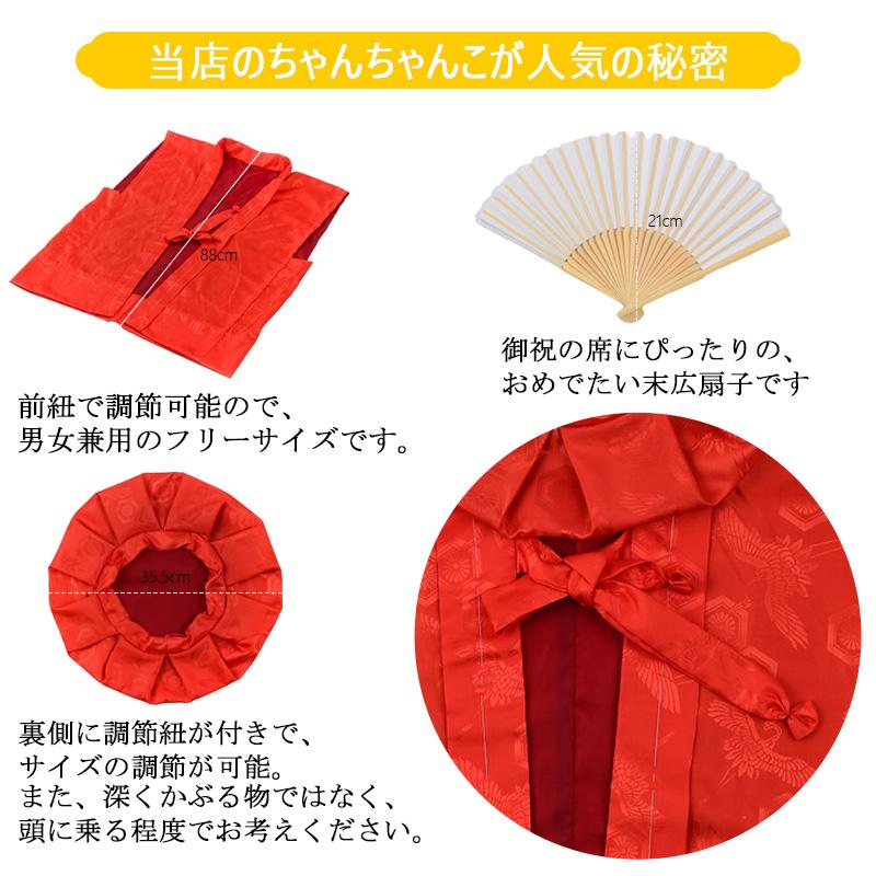 注意点:ちゃんちゃんこや頭巾に関しましては、長寿お祝いの撮影用などに一時的に着用するものとなりますので、ちゃんちゃんこは羽織るという感覚で、また頭巾に関しては、頭に乗せるという感覚でお使いください。