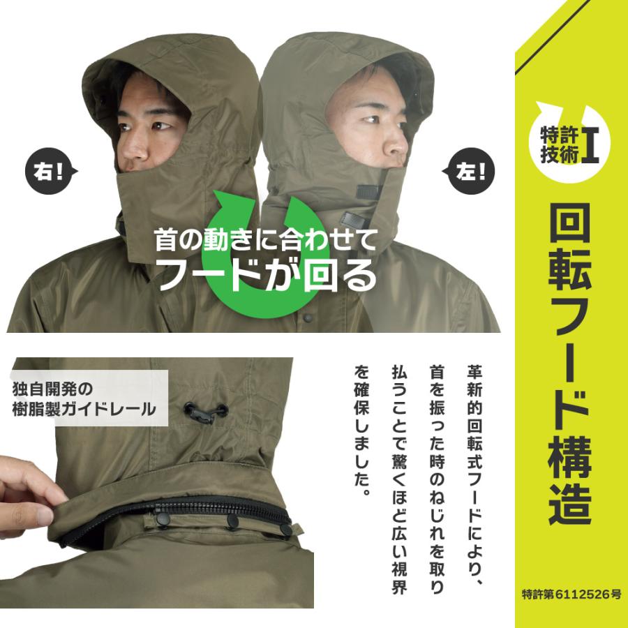 特許技術を取得した回転フードを採用。ガイドレールにより首の動きに合わせてフードが回るため、左右や後方の確認がしやすい作りになっています。