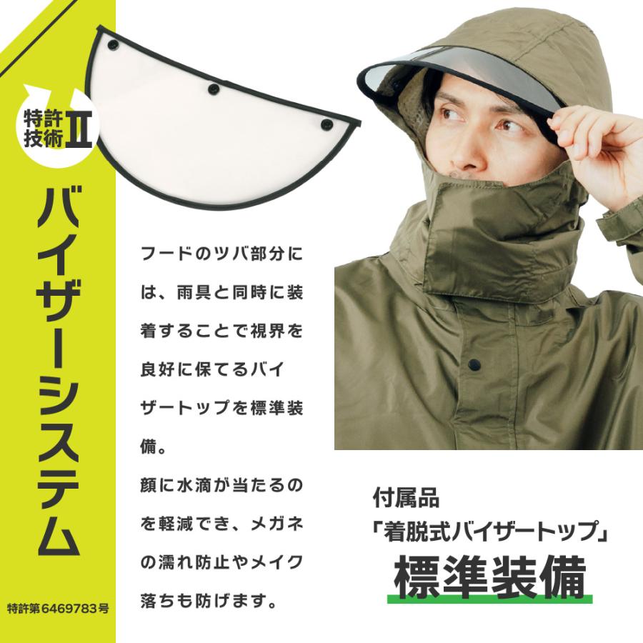| 商品説明 | フードとボディ部分を分離した独自の回転フードを搭載し、驚異的な視界を実現した革新的レインスーツです。取り外し可能な透明のバイザートップ付き。雨の日の自転車運転を安全・快適にします。 |