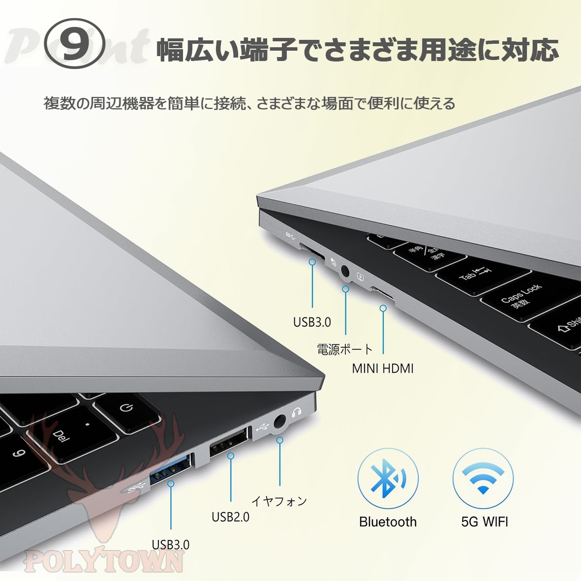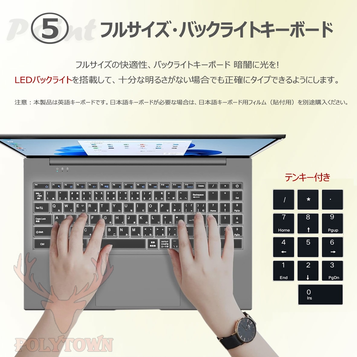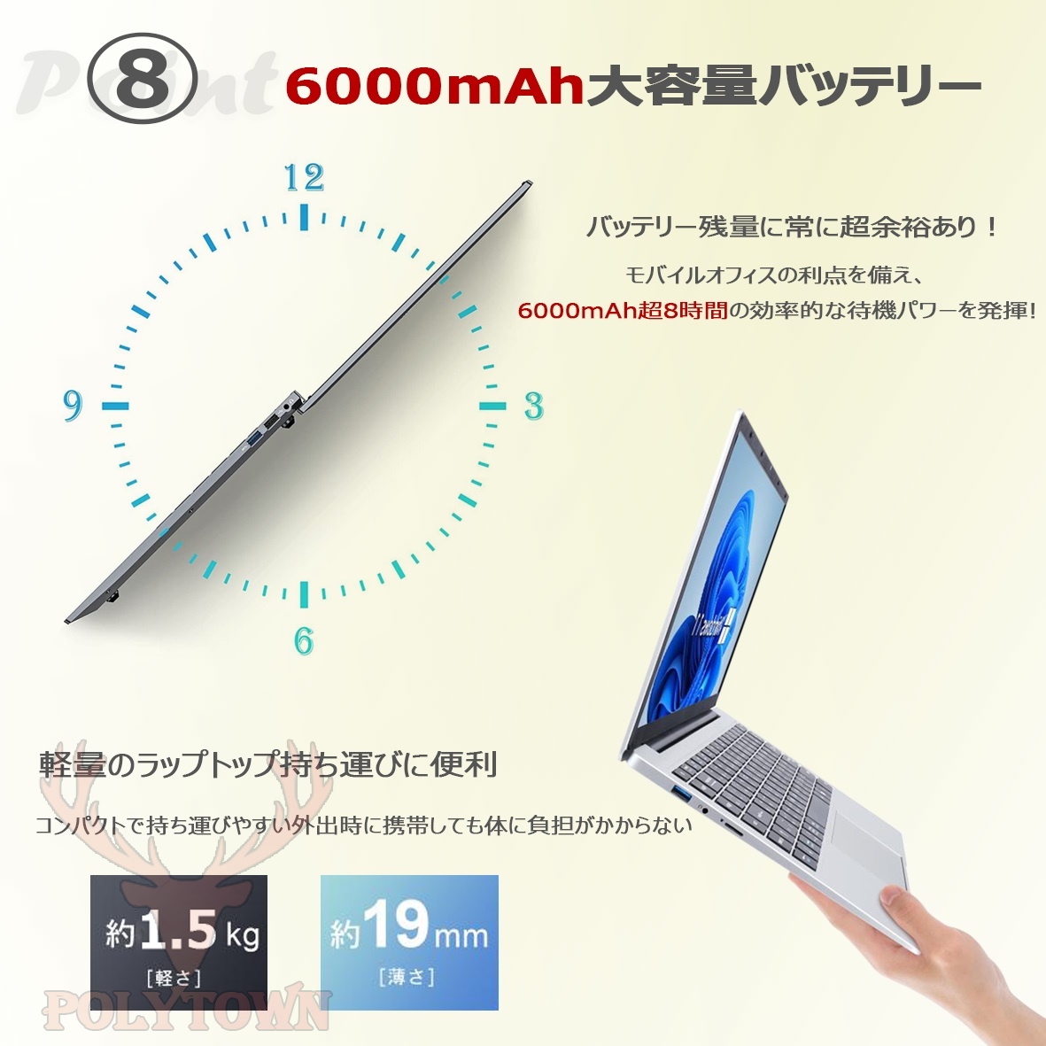 ノートパソコンの重量約1.5Kg、薄型で持ち運びに負担を減らせます!小さなカバンやハンドバッグにも収納できるビジネスやプライベートの外出先での使用など、コンパクトで持ち運びなので、外出時に携帯しても身体に負担がかからない。6000mAhの大容量バッテリー、長時間の駆動を実現し、オフィス作業やエンターテインメントに便利です。数字入力がしやすいテンキーも搭載して会計処理、事務作業、家計薄、レポート作成などのスピートを大幅アップ。