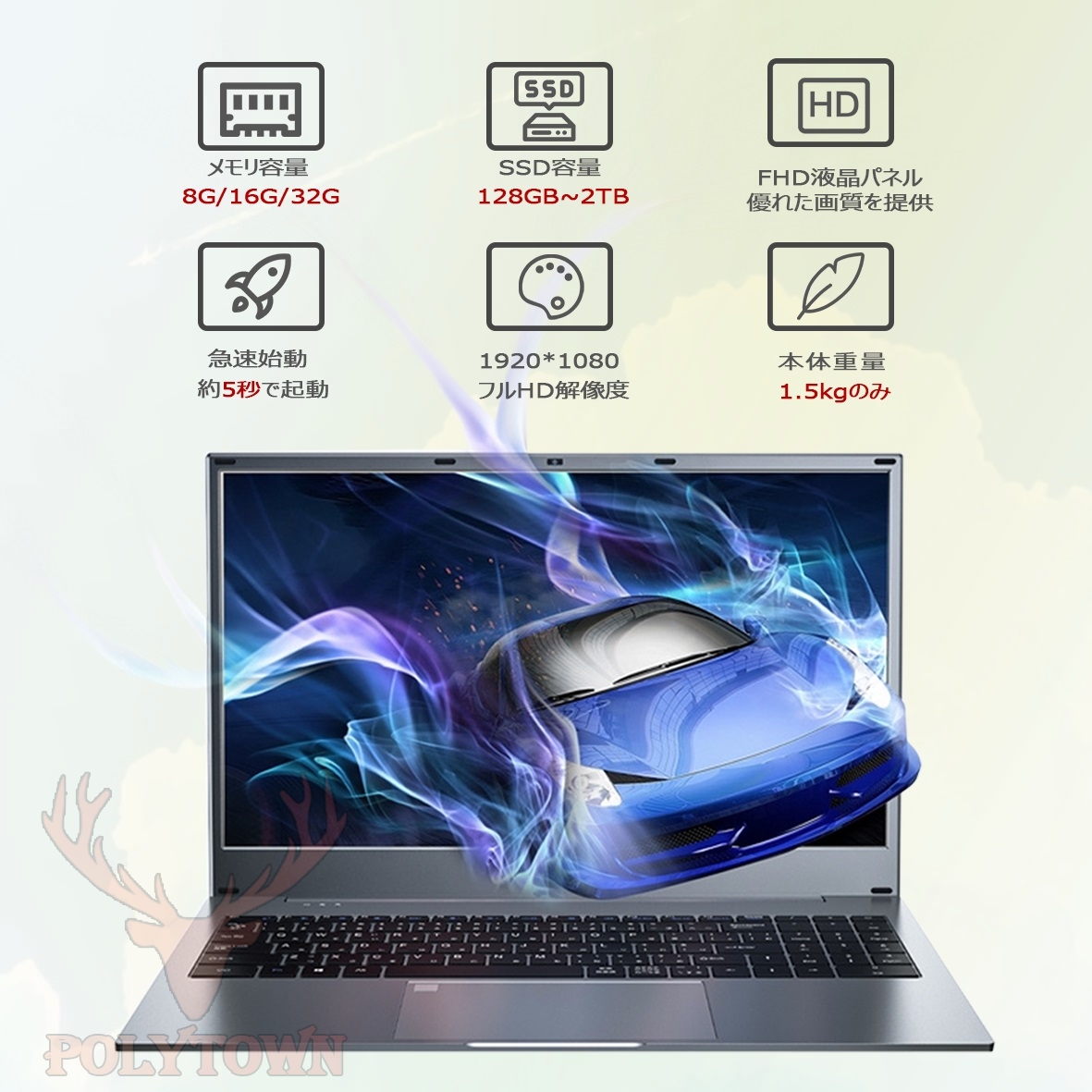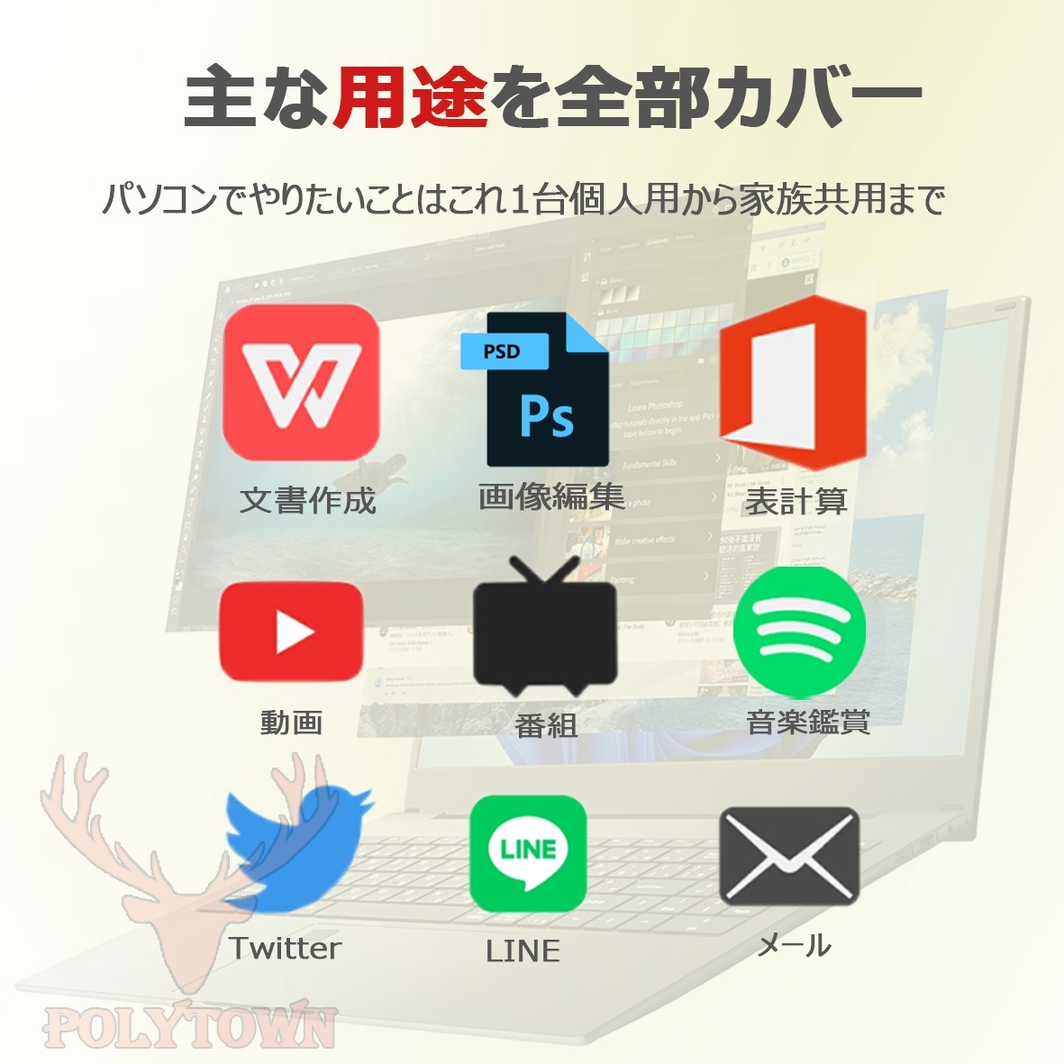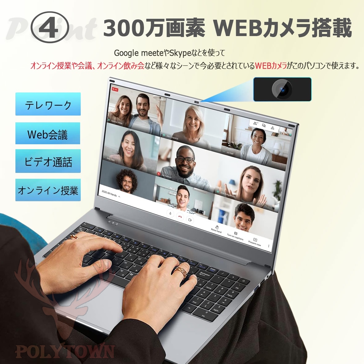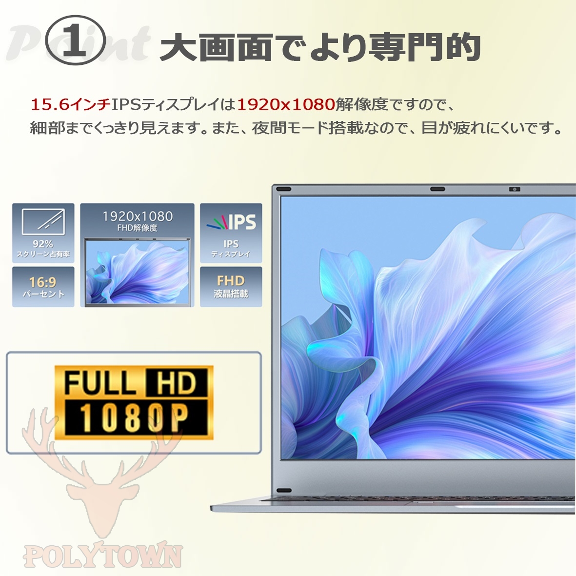 15.6インチノートパソコンの画面でディスプレイが大きくなると一度に映せる情報量が多くなって作業性が向上します。 解像度1920*1080フルHD IPS液晶スクリーンは、狭いフレームと高い画面対ボディ比を備えており、ユーザーに広くクリアな視界を提供します、IPS非光沢ディスプレイを搭載し、反射が少ないぶん目が疲れにくい、Webカメラ内蔵されてインタネット、メール、写真管理・閲覧、動画視聴、文章作成、表計算、年賀状作成、音楽視聴、ゲーム、Google meetやLINE、オンライン授業や会議などの様々な用途でご使用いただけます。勉強や仕事、オフィスワーク、プレゼントなどにも最適用です。