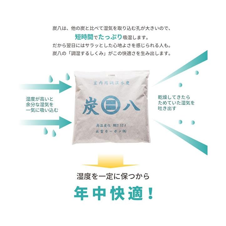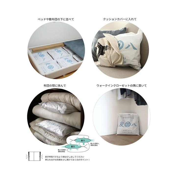 布団の間に挟むと、湿気がとれてふっくらします。炭八を布団から少し出して呼吸できるようにしてください。