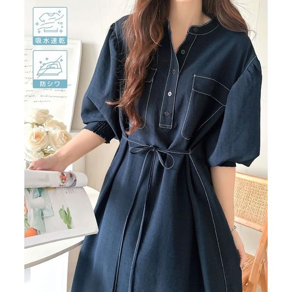 商品名:【UVカット・吸水速乾・防シワ機能付き】主役級!さらりと着られるシンプル派のためのノーカラー袖ボリューム ダブルポケットワンピース